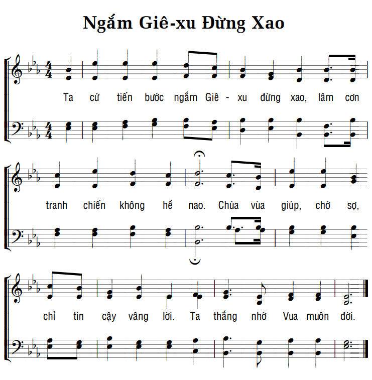 1. Ta cứ tiến bước ngắm Giê-xu đừng xao, lâm cơn tranh chiến không hề nao. Chúa vùa giúp, chớ sợ, chỉ tin cậy vâng lời. Ta thắng nhờ Vua muôn đời.