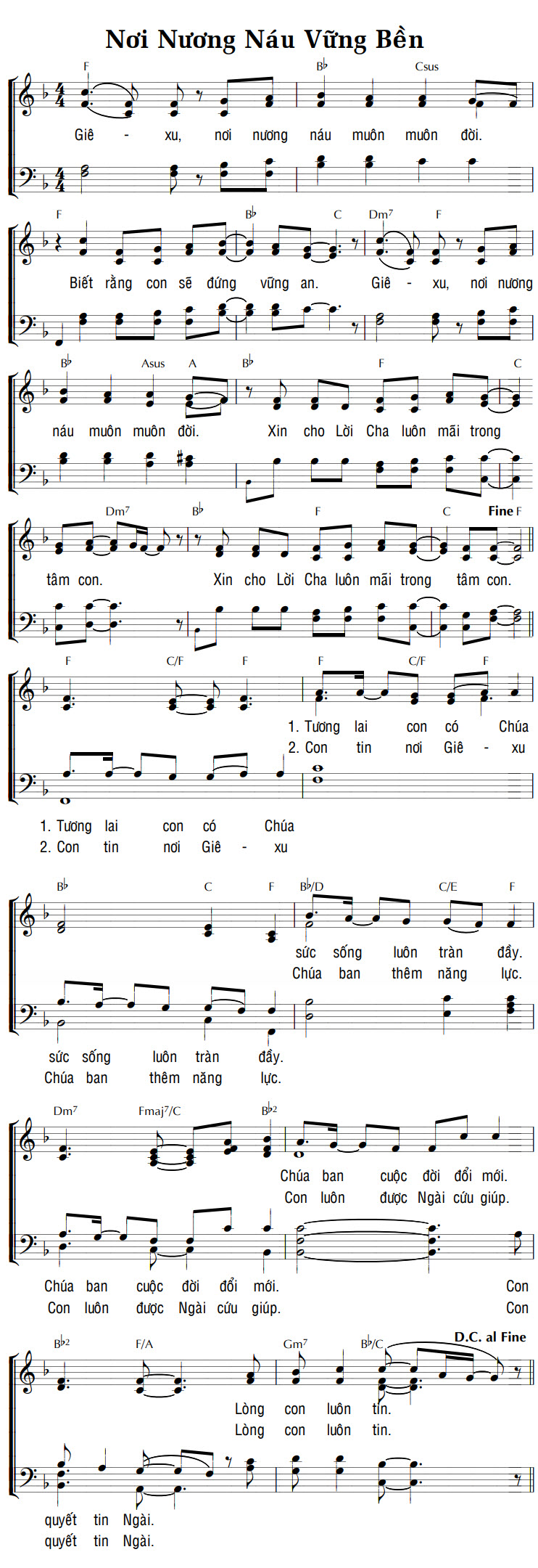1. Giê-xu, nơi nương náu muôn muôn đời. Biết rằng con sẽ đứng vững an. Giê-xu, nơi nương náu muôn muôn đời. Xin cho Lời Cha luôn mãi trong tâm con. Xin cho Lời Cha luôn mãi trong tâm con. Tương lai con có Chúa sức sống luôn tràn đầy. Chúa ban cuộc đời đổi mới. Lòng con luôn tin. 2. Giê-xu, nơi nương náu muôn muôn đời. Biết rằng con sẽ đứng vững an. Giê-xu, nơi nương náu muôn muôn đời. Xin cho Lời Cha luôn mãi trong tâm con. Xin cho Lời Cha luôn mãi trong tâm con. Con tin nơi Giê-xu Chúa ban thêm năng lực. Con luôn được Ngài cứu giúp. Lòng con luôn quyết tin Ngài.