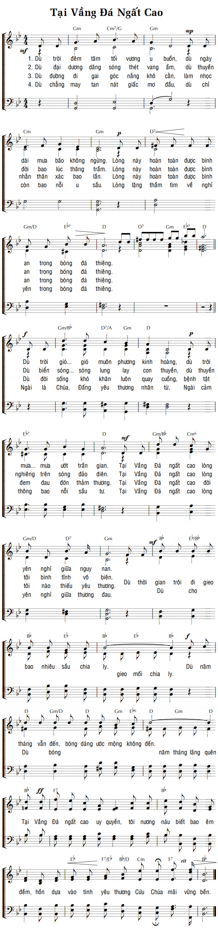 1. Dù trời đêm tăm tối vương u buồn, dù ngày dài mưa bão không ngừng. Lòng này hoàn toàn được bình an trong bóng đá thiêng. Dù trời gió... gió muôn phương kinh hoàng, dù trời mưa... mưa ướt trần gian. Tại Vầng Đá ngất cao lòng yên nghỉ giữa nguy nan. Dù thời gian trôi đi gieo bao nhiêu sầu chia ly. Dù năm tháng vẫn đến, bóng dáng ước mộng không đến. 2. Dù đại dương dâng sóng thét vang ẩm, dù thuyền đời bao lúc thăng trầm. Lòng này hoàn toàn được bình an trong bóng đá thiêng. Dù biển sóng... sóng lung lay con thuyền, dù thuyền nghiêng trên sóng đảo điên. Tại Vầng Đá ngất cao lòng tôi bình tĩnh vô biên. Dù gieo mối chia ly. Dù bóng năm tháng lãng quên. 3. Dù đường đi gai góc nắng khô cằn, làm nhọc nhằn thân xác bao lần. Lòng này hoàn toàn được bình an trong bóng đá thiêng. Dù đời sống khó khăn luôn quay cuồng, bệnh tật đem đau đớn thảm thương. Tại Vầng Đá ngất cao đời tôi nào thiếu yêu thương. 4. Dù chẳng may tan nát giấc mơ đầu, dù chỉ còn bao nỗi u sầu. Lòng lặng thầm tìm về nghỉ yên trong bóng đá thiêng. Ngài là Chúa, Đấng yêu thương nhân từ, Ngài cảm thông bao nỗi sầu tư. Tại Vầng Đá ngất cao lòng yên nghỉ giữa thương đau. Điệp khúc: Tại Vầng Đá ngất cao uy quyền, tôi nương náu biết bao êm đềm, hồn dựa vào tình yêu thương Cứu Chúa mãi vững bền.