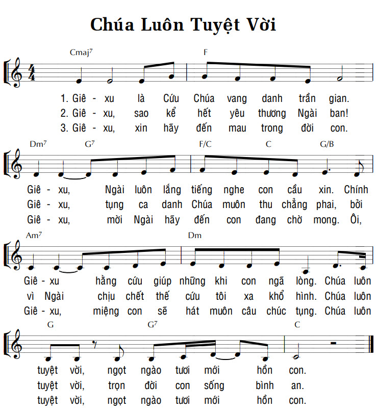 1. Giê-xu là Cứu Chúa vang danh trần gian. Giê-xu, Ngài luôn lắng tiếng nghe con cầu xin. Chính Giê-xu hằng cứu giúp những khi con ngã lòng. Chúa luôn tuyệt vời, ngọt ngào tươi mới hồn con. 2. Giê-xu, sao kể hết yêu thương Ngài ban! Giê-xu, tụng ca danh Chúa muôn thu chẳng phai, bởi vì Ngài chịu chết thế cứu tôi xa khổ hình. Chúa luôn tuyệt vời, trọn đời con sống bình an. 3. Giê-xu, xin hãy đến mau trong đời con. Giê-xu, mời Ngài hãy đến con đang chờ mong. Ôi, Giê-xu, miệng con sẽ hát muôn câu chúc tụng. Chúa luôn tuyệt vời, ngọt ngào tươi mới hồn con.