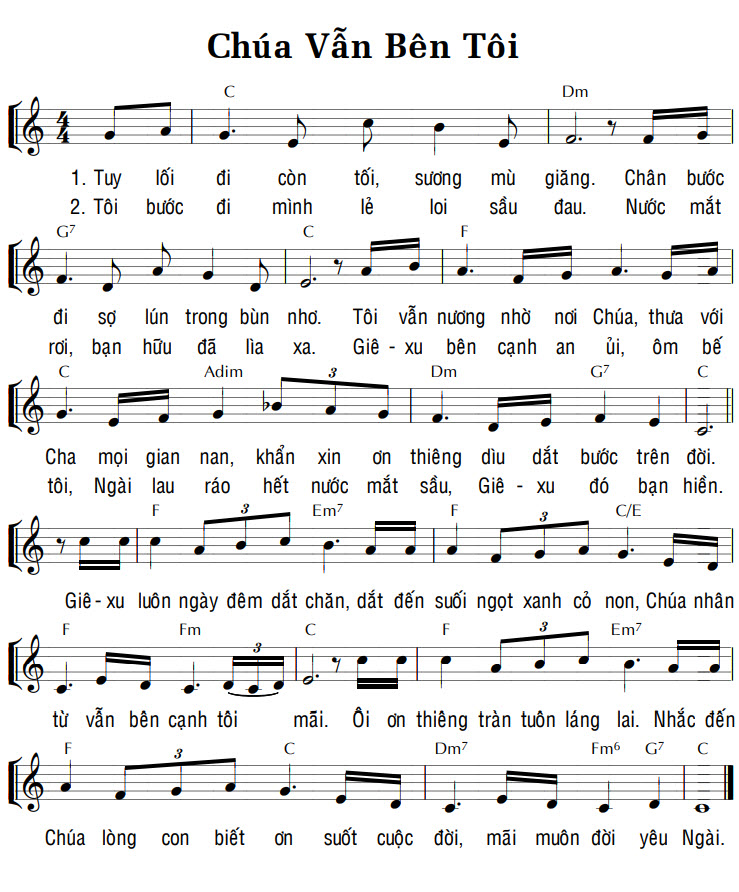 1. Tuy lối đi còn tối, sương mù giăng. Chân bước đi sợ lún trong bùn nhơ. Cha mọi gian nan, khẩn xin ơn thiêng dìu dắt bước trên đời. Giê-xu luôn ngày đêm dắt chăn, dắt đến suối ngọt xanh cỏ non, Chúa nhân từ vẫn bên cạnh tôi mãi. 2. Tôi bước đi mình lẻ loi sầu đau. Nước mắt rơi, bạn hữu đã lìa xa. Giê-xu bên cạnh an ủi, ôm bế tôi, Ngài lau ráo hết nước mắt sầu, Giê-xu đó bạn hiền. Giê-xu luôn ngày đêm dắt chăn, dắt đến suối ngọt xanh cỏ non, Chúa nhân từ vẫn bên cạnh tôi mãi. Điệp khúc: Ôi ơn thiêng tràn tuôn láng lai. Nhắc đến Chúa lòng con biết ơn suốt cuộc đời, mãi muôn đời yêu Ngài.