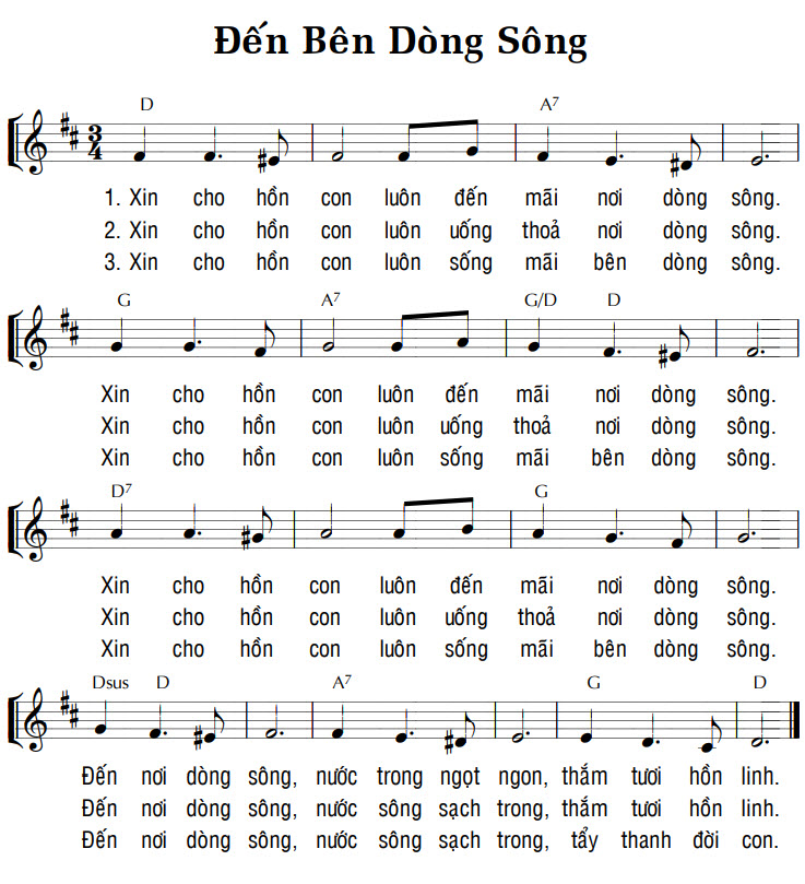 1. Xin cho hồn con luôn đến mãi nơi dòng sông. Xin cho hồn con luôn đến mãi nơi dòng sông. Xin cho hồn con luôn đến mãi nơi dòng sông. 2. Xin cho hồn con luôn uống thoả nơi dòng sông. Xin cho hồn con luôn uống thoả nơi dòng sông. Xin cho hồn con luôn uống thoả nơi dòng sông. 3. Xin cho hồn con luôn sống mãi bên dòng sông. Xin cho hồn con luôn sống mãi bên dòng sông. Xin cho hồn con luôn sống mãi bên dòng sông. Điệp khúc: Đến nơi dòng sông, nước trong ngọt ngon, thắm tươi hồn linh. Đến nơi dòng sông, nước sông sạch trong, thắm tươi hồn linh. Đến nơi dòng sông, nước sông sạch trong, tẩy thanh đời con.