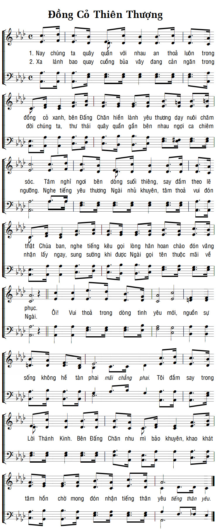 1. Nay chúng ta quây quần với nhau an thoả luôn trong đồng cỏ xanh, bên Đấng Chăn hiền lành yêu thương dạy nuôi chăm sóc. Tâm nghỉ ngơi bên dòng suối thiêng, say đắm theo lẽ thật Chúa ban, nghe tiếng kêu gọi lòng hân hoan chào đón vâng phục. Ôi! Vui thoả trong dòng tình yêu mới, nguồn sự sống không hề tàn phai mãi chẳng phai. Tôi đắm say trong Lời Thánh Kinh. Bên Đấng Chăn nhu mì bảo khuyên, khao khát tâm hồn chờ mong đón nhận tiếng thân yêu tiếng thân yêu. 2. Xa lánh bao quay cuồng bủa vây đang cản ngăn trong đời chúng ta, thư thái quây quần gần bên nhau ngợi ca chiêm ngưỡng. Nghe tiếng yêu thương Ngài nhủ khuyên, tâm thoả vui đón nhận lấy ngay, sung sướng khi được Ngài gọi tên thuộc mãi về Ngài. Ôi! Vui thoả trong dòng tình yêu mới, nguồn sự sống không hề tàn phai mãi chẳng phai. Tôi đắm say trong Lời Thánh Kinh. Bên Đấng Chăn nhu mì bảo khuyên, khao khát tâm hồn chờ mong đón nhận tiếng thân yêu tiếng thân yêu.