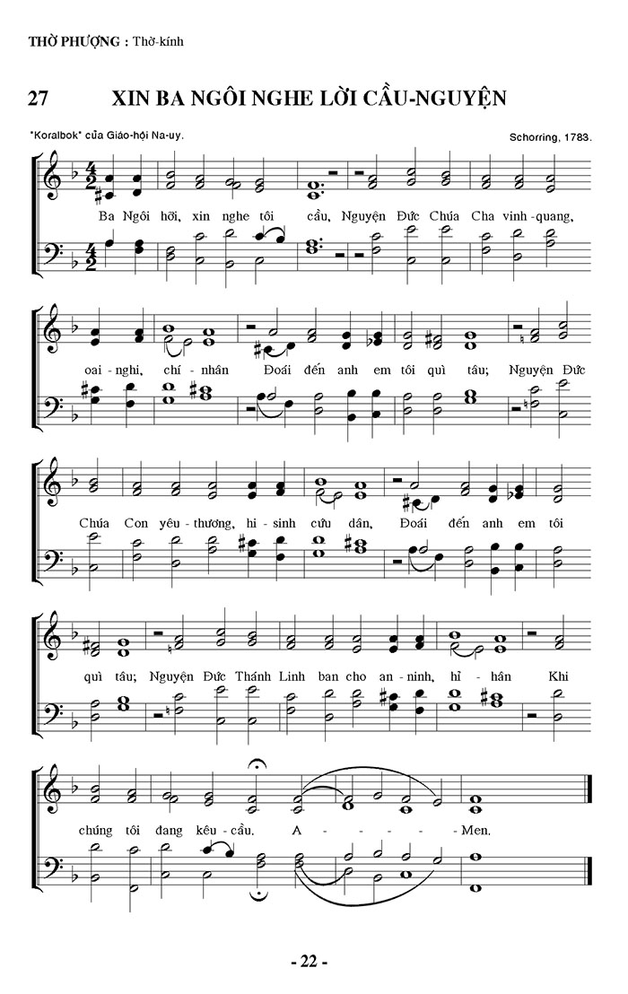 1. Ba Ngôi hỡi, xin nghe tôi cầu, Nguyện Đức Chúa Cha vinh-quang, oai-nghi, chí-nhân Đoái đến anh em tôi quì tâu; Nguyện Đức chúng tôi đang kêu-cầu. A - - Men. 2. Chúa Con yêu-thương, hi-sinh cứu dân, Đoái đến anh em tôi quì tâu; Nguyện Đức chúng tôi đang kêu-cầu. A - - Men. 3. Thánh Linh ban cho an-ninh, hỉ-hân Khi chúng tôi đang kêu-cầu. A - - Men.