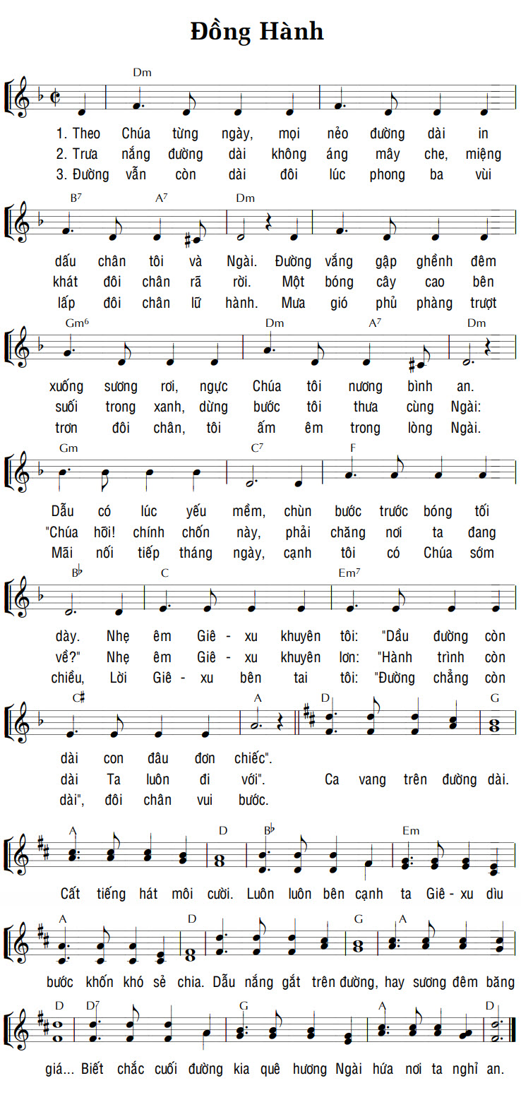 1. Theo Chúa từng ngày, mọi nẻo đường dài in dấu chân tôi và Ngài. Đường vắng gập ghềnh đêm xuống sương rơi, ngực Chúa tôi nương bình an. Dẫu có lúc yếu mềm, chùn bước trước bóng tối dày. Nhẹ êm Giê-xu khuyên tôi: "Dầu đường còn dài con đâu đơn chiếc". 2. Trưa nắng đường dài không áng mây che, miệng khát đôi chân rã rời. Một bóng cây cao bên suối trong xanh, dừng bước tôi thưa cùng Ngài: "Chúa hỡi! chính chốn này, phải chăng nơi ta đang về?" Nhẹ êm Giê-xu khuyên lơn: "Hành trình còn dài Ta luôn đi với". 3. Đường vẫn còn dài đôi lúc phong ba vùi lấp đôi chân lữ hành. Mưa gió phủ phàng trượt trơn đôi chân, tôi ấm êm trong lòng Ngài. Mãi nối tiếp tháng ngày, cạnh tôi có Chúa sớm chiều, Lời Giê-xu bên tai tôi: "Đường chẳng còn dài", đôi chân vui bước. chorus. Ca vang trên đường dài. Cất tiếng hát môi cười. Luôn luôn bên cạnh ta Giê-xu dìu bước khốn khó sẻ chia. Dẫu nắng gắt trên đường, hay sương đêm băng giá... Biết chắc cuối đường kia quê hương Ngài hứa nơi ta nghỉ an. Điệp khúc: Ca vang trên đường dài. Cất tiếng hát môi cười. Luôn luôn bên cạnh ta Giê-xu dìu bước khốn khó sẻ chia. Dẫu nắng gắt trên đường, hay sương đêm băng giá... Biết chắc cuối đường kia quê hương Ngài hứa nơi ta nghỉ an.