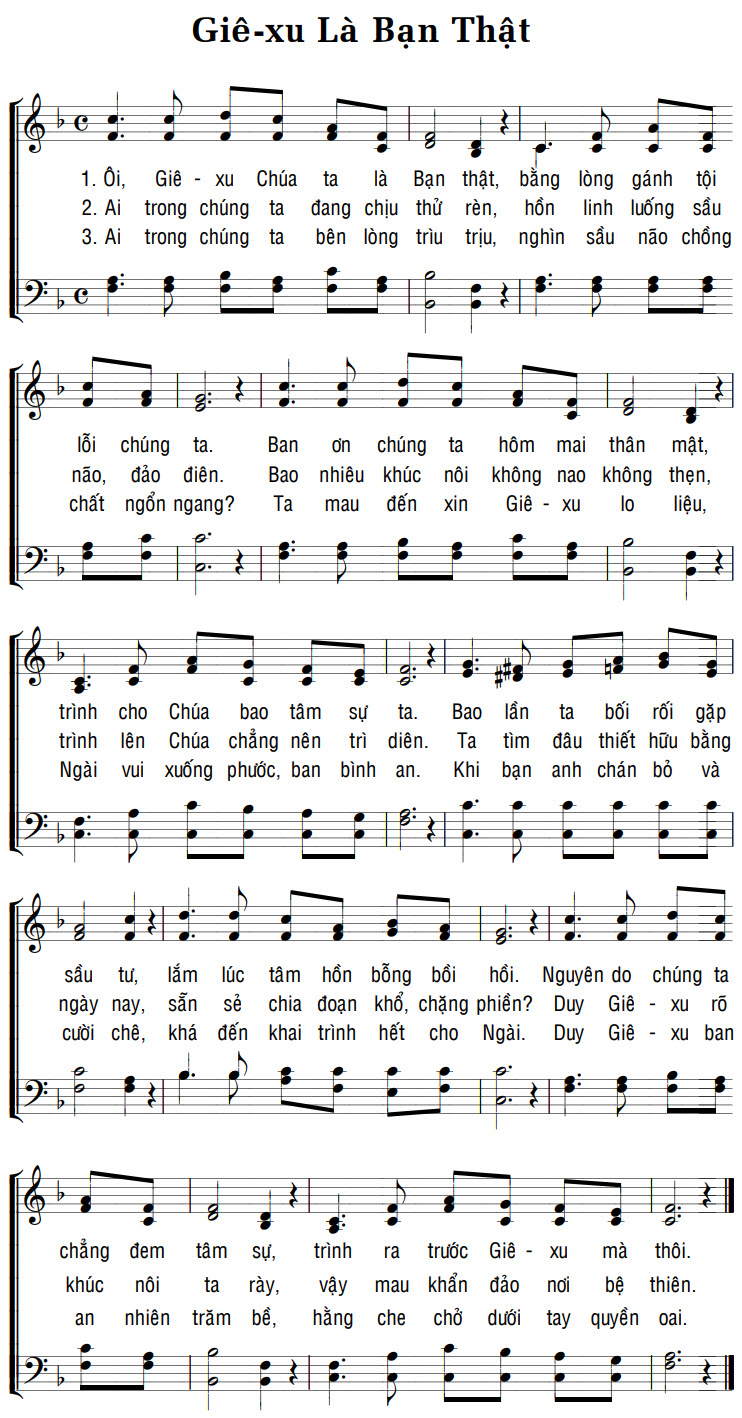 1. Ôi, Giê-xu Chúa ta là Bạn thật, bằng lòng gánh tội lỗi chúng ta. Ban ơn chúng ta hôm mai thân mật, chẳng đem tâm sự, trình ra trước Giê-xu mà thôi. 2. Ai trong chúng ta đang chịu thử rèn, hồn linh luống sầu não, đảo điên. Bao nhiêu khúc nôi không nao không thẹn, vậy mau khẩn đảo nơi bệ thiên. trình cho Chúa bao tâm sự ta. Bao lần ta bối rối gặp trình lên Chúa chẳng nên trì diên. Ta tìm đâu thiết hữu bằng sầu tư, lắm lúc tâm hồn bỗng bồi hồi. Nguyên do chúng ta ngày nay, sẵn sẻ chia đoạn khổ, chặng phiền? Duy Giê-xu rõ 3. Ai trong chúng ta bên lòng trìu trịu, nghìn sầu não chồng chất ngổn ngang? Ta mau đến xin Giê-xu lo liệu, an nhiên trăm bề, hằng che chở dưới tay quyền oai. Ngài vui xuống phước, ban bình an. Khi bạn anh chán bỏ và cười chê, khá đến khai trình hết cho Ngài. Duy Giê-xu ban