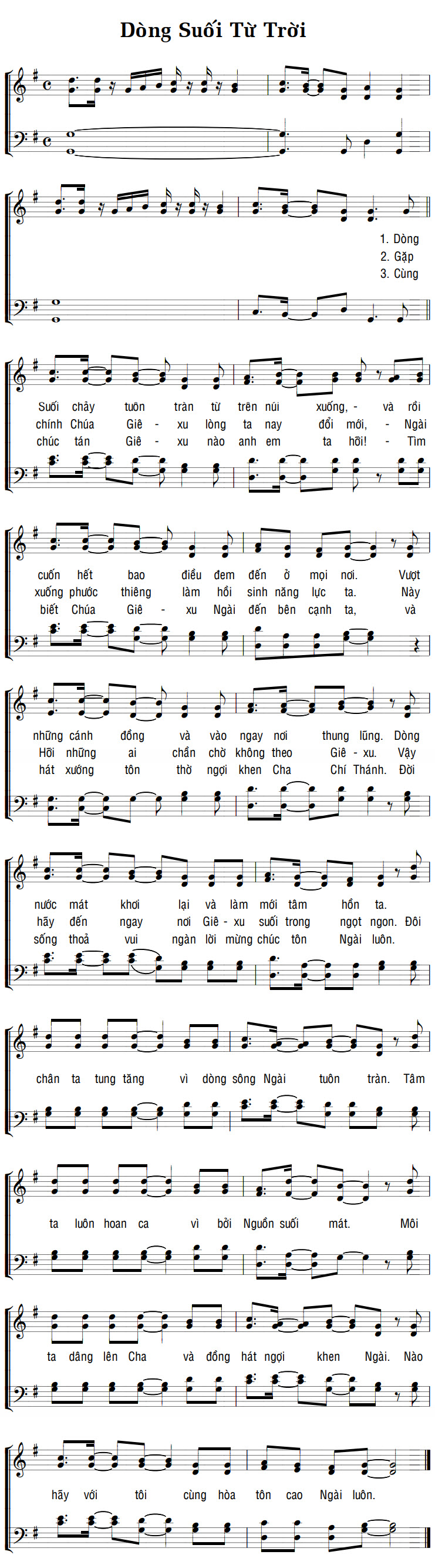 1. Suối chảy tuôn tràn từ trên núi xuống, và rồi cuốn hết bao điều đem đến ở mọi nơi. Vượt những cánh đồng và vào ngay nơi thung lũng. Dòng nước mát khơi lại và làm mới tâm hồn ta. chân ta tung tăng vì dòng sông Ngài tuôn tràn. Tâm ta luôn hoan ca vì bởi Nguồn suối mát. Môi ta dâng lên Cha và đồng hát ngợi khen Ngài. Nào hãy với tôi cùng hòa tôn cao Ngài luôn. 2. Gặp chính Chúa Giê-xu lòng ta nay đổi mới, Ngài xuống phước thiêng làm hồi sinh năng lực ta. Này Hồi những ai chần chờ không theo Giê-xu. Vậy hãy đến ngay nơi Giê-xu suối trong ngọt ngon. Đôi chân ta tung tăng vì dòng sông Ngài tuôn tràn. Tâm ta luôn hoan ca vì bởi Nguồn suối mát. Môi ta dâng lên Cha và đồng hát ngợi khen Ngài. Nào hãy với tôi cùng hòa tôn cao Ngài luôn. 3. Cùng chúc tán Giê-xu nào anh em ta hồi! Tìm biết Chúa Giê-xu Ngài đến bên cạnh ta, và hát xướng tôn thờ ngợi khen Cha Chí Thánh. Đời sống thoả vui ngàn lời mừng chúc tôn Ngài luôn. chân ta tung tăng vì dòng sông Ngài tuôn tràn. Tâm ta luôn hoan ca vì bởi Nguồn suối mát. Môi ta dâng lên Cha và đồng hát ngợi khen Ngài. Nào hãy với tôi cùng hòa tôn cao Ngài luôn.