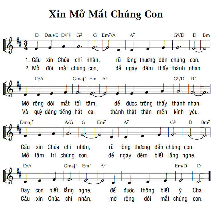 1. Cầu xin Chúa chí nhân, rủ lòng thương đến chúng con. Mở rộng đôi mắt tối tăm, để được trông thấy thánh nhan. Cầu xin Chúa chí nhân, rủ lòng thương đến chúng con. Dạy con biết lắng nghe, để được thông biết ý Cha. 2. Mở đôi mắt chúng con, để ngày đêm thấy thánh nhan. Và quỳ dâng tiếng hát ca, thành thật thân mến kính yêu. Mở tâm trí chúng con, để ngày đêm biết lắng nghe. Cầu xin Chúa chí nhân, mở rộng đôi mắt chúng con.