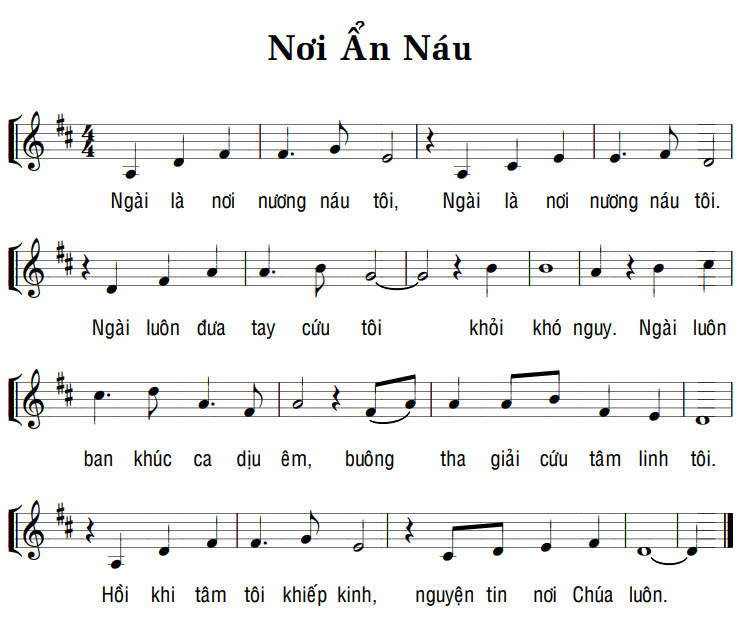 1. Ngài là nơi nương náu tôi, Ngài là nơi nương náu tôi. Ngài luôn đưa tay cứu tôi khỏi khó nguy. Ngài luôn ban khúc ca dịu êm, buông tha giải cứu tâm linh tôi. Hồi khi tâm tôi khiếp kinh, nguyện tin nơi Chúa luôn.