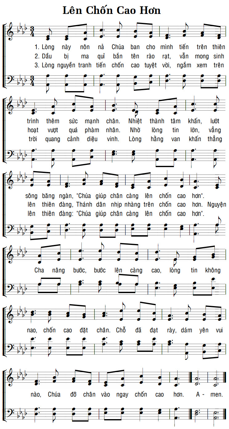 1. Lòng này nôn nả Chúa ban cho mình tiến trên thiên trình thêm sức mạnh chân. Nhiệt thành tâm khấn, lướt sông băng ngàn, "Chúa giúp chân càng lên chốn cao hơn". Cha nâng bước, bước lên càng cao, lòng tin không nao, chốn cao đặt chân. Chỗ đã đạt rày, dám yên vui nào, Chúa đỡ chân vào ngay chốn cao hơn. A - men. 2. Dầu bị ma quỉ bắn tên rào rạt, vẫn mong sinh hoạt vượt quá phàm nhân. Nhờ lòng tin lớn, vắng lên thiên đàng, Thánh dân nhịp nhàng trên chốn cao hơn. Nguyện Cha nâng bước, bước lên càng cao, lòng tin không nao, chốn cao đặt chân. Chỗ đã đạt rày, dám yên vui nào, Chúa đỡ chân vào ngay chốn cao hơn. A - men. 3. Lòng nguyền tranh tiến chốn cao tuyệt vời, ngắm xem trên trời quang cảnh diệu vinh. Lòng hằng van khấn thẳng lên thiên đàng: "Chúa giúp chân càng lên chốn cao hơn". Cha nâng bước, bước lên càng cao, lòng tin không nao, chốn cao đặt chân. Chỗ đã đạt rày, dám yên vui nào, Chúa đỡ chân vào ngay chốn cao hơn. A - men.