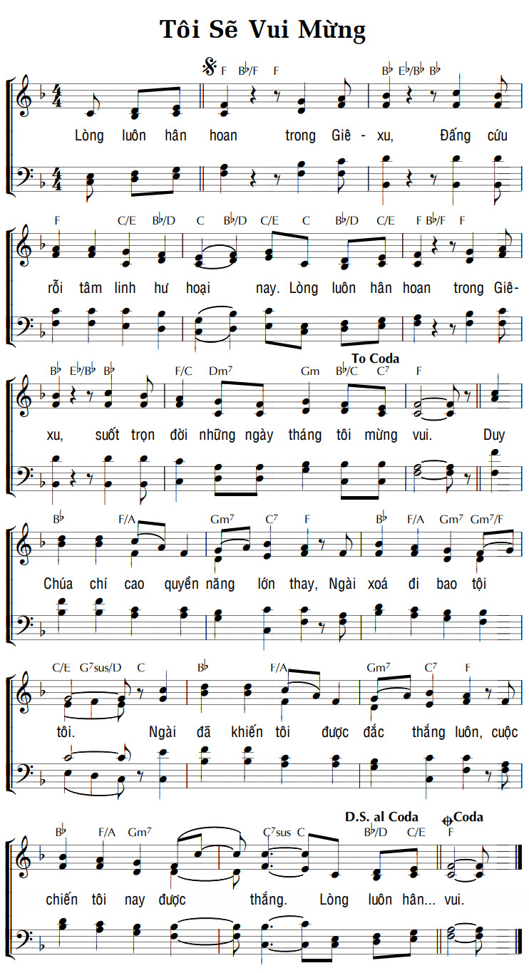 Điệp khúc: Lòng luôn hân hoan trong Giê-xu, Đấng cứu rỗi tâm linh hư hoại nay. Lòng luôn hân hoan trong Giê-xu, suốt trọn đời những ngày tháng tôi mừng vui. Duy Chúa chí cao quyền năng lớn thay, Ngài xoá đi bao tội tôi. Ngài đã khiến tôi được đắc thắng luôn, cuộc chiến tôi nay được thắng. Lòng luôn hân... vui.