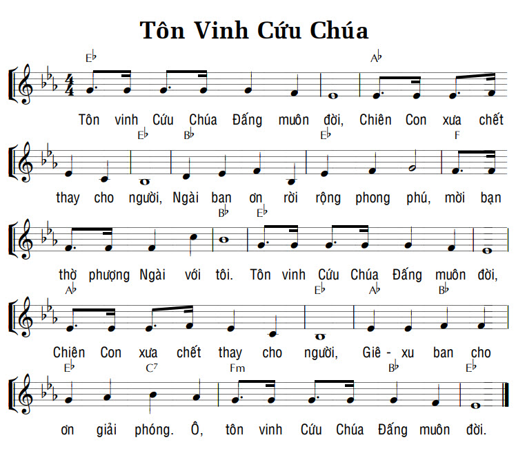 1. Tôn vinh Cứu Chúa Đấng muôn đời, Chiên Con xưa chết thay cho người, Ngài ban ơn rời rộng phong phú, mời bạn thờ phượng Ngài với tôi. Tôn vinh Cứu Chúa Đấng muôn đời, Chiên Con xưa chết thay cho người, Giê-xu ban cho ơn giải phóng. Ô, tôn vinh Cứu Chúa Đấng muôn đời.