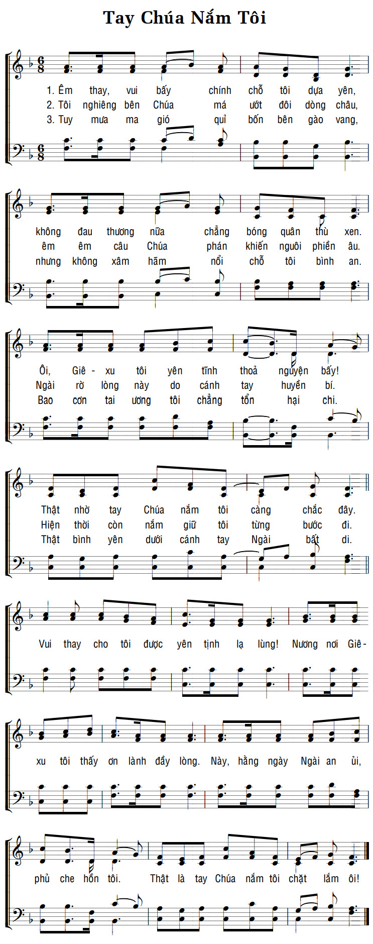 1. Êm thay, vui bấy chính chỗ tôi dựa yên, không đau thương nữa chẳng bóng quân thù xen. Ôi, Giê-xu tôi yên tĩnh thoả nguyện bấy! Thật nhờ tay Chúa nắm tôi càng chắc đây. 2. Tôi nghiêng bên Chúa má ướt đôi dòng châu, êm êm câu Chúa phán khiến nguôi phiền âu. Ngài rờ lòng này do cánh tay huyền bí. Hiện thời còn nắm giữ tôi từng bước đi. 3. Tuy mưa ma gió quỉ bốn bên gào vang, nhưng không xâm hãm nổi chỗ tôi bình an. Bao cơn tai ương tôi chẳng tổn hại chi. Thật bình yên dưới cánh tay Ngài bất di. 4. Vui thay cho tôi được yên tịnh lạ lùng! Nương nơi Giê-xu tôi thấy ơn lành đầy lòng. Này, hằng ngày Ngài an ủi, phủ che hồn tôi. Thật là tay Chúa nắm tôi chặt lắm ôi!