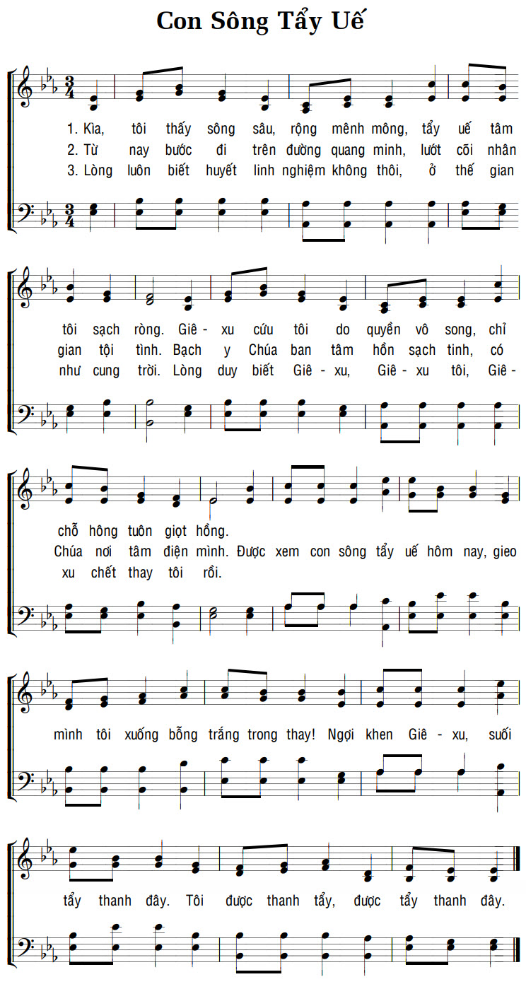 1. Kìa, tôi thấy sông sâu, rộng mênh mông, tẩy uế tâm tôi sạch ròng. Giê-xu cứu tôi do quyền vô song, chỉ chỗ hông tuôn giọt hồng. Mình tôi xuống bỗng trắng trong thay! Ngợi khen Giê-xu, suối tẩy thanh đây. Tôi được thanh tẩy, được tẩy thanh đây. 2. Từ nay bước đi trên đường quang minh, lướt cõi nhân gian tội tình. Bạch y Chúa ban tâm hồn sạch tinh, có Chúa nơi tâm điện mình. Được xem con sông tẩy uế hôm nay, gieo tôi được thanh tẩy, được tẩy thanh đây. 3. Lòng luôn biết huyết linh nghiệm không thôi, ở thế gian như cung trời. Lòng duy biết Giê-xu, Giê-xu tôi, Giê-xu chết thay tôi rồi. Ngợi khen Giê-xu, suối tẩy thanh đây. Tôi được thanh tẩy, được tẩy thanh đây.