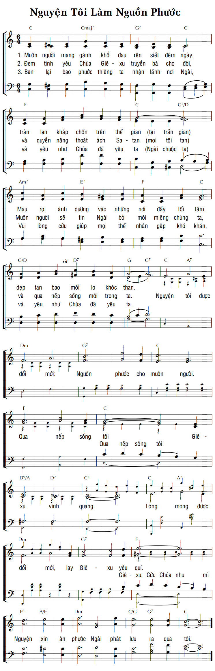 1. Muôn người mang gánh khổ đau rên siết đêm ngày, tràn lan khắp chốn trên thế gian (tại trần gian) Mau rọi ánh dương vào những nơi đầy tối tăm, dẹp tan bao mối lo khóc than. Nguyện tôi được đổi mới: Nguồn phước cho muôn người. Qua nếp sống tôi Giê-xu vinh quang. Lòng mong được đổi mới, lạy Giê-xu yêu quí. Nguyện xin ân phước Ngài phát lưu ra qua tôi. 2. Đem tình yêu Chúa Giê-xu truyền bá cho đời, và quyền năng thoát ách Sa-tan (mọi tội tan) Muôn người sẽ tin Ngài bởi môi miệng chúng ta, và qua nếp sống mới trong ta. Nguyện tôi được đổi mới: Nguồn phước cho muôn người. Qua nếp sống tôi Giê-xu vinh quang. Lòng mong được đổi mới, lạy Giê-xu yêu quí. Nguyện xin ân phước Ngài phát lưu ra qua tôi. 3. Ban lại bao phước thiêng ta nhận lãnh nơi Ngài, và yêu như Chúa đã yêu ta (Ngài chuộc ta) Vui lòng cứu giúp mọi thế nhân gặp khó khăn, và yêu như Chúa đã yêu ta. Nguyện tôi được đổi mới: Nguồn phước cho muôn người. Qua nếp sống tôi Giê-xu vinh quang. Lòng mong được đổi mới, lạy Giê-xu yêu quí. Giê-xu, Cứu Chúa nhu mì. Nguyện xin ân phước Ngài phát lưu ra qua tôi.