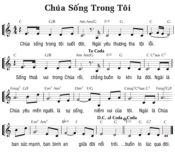 1. Chúa sống trong tôi suốt đời, Ngài yêu thương tha tội lỗi. Sống thoả vui trong Chúa rồi, chẳng buồn lo khi lìa đời. Ngài là Chúa yêu mến người, là sự sống, niềm vui của tôi. Ngài là Chúa ban sức mạnh, ban bình an giữa đời nổi trôi. ...buồn lo lúc qua đời.