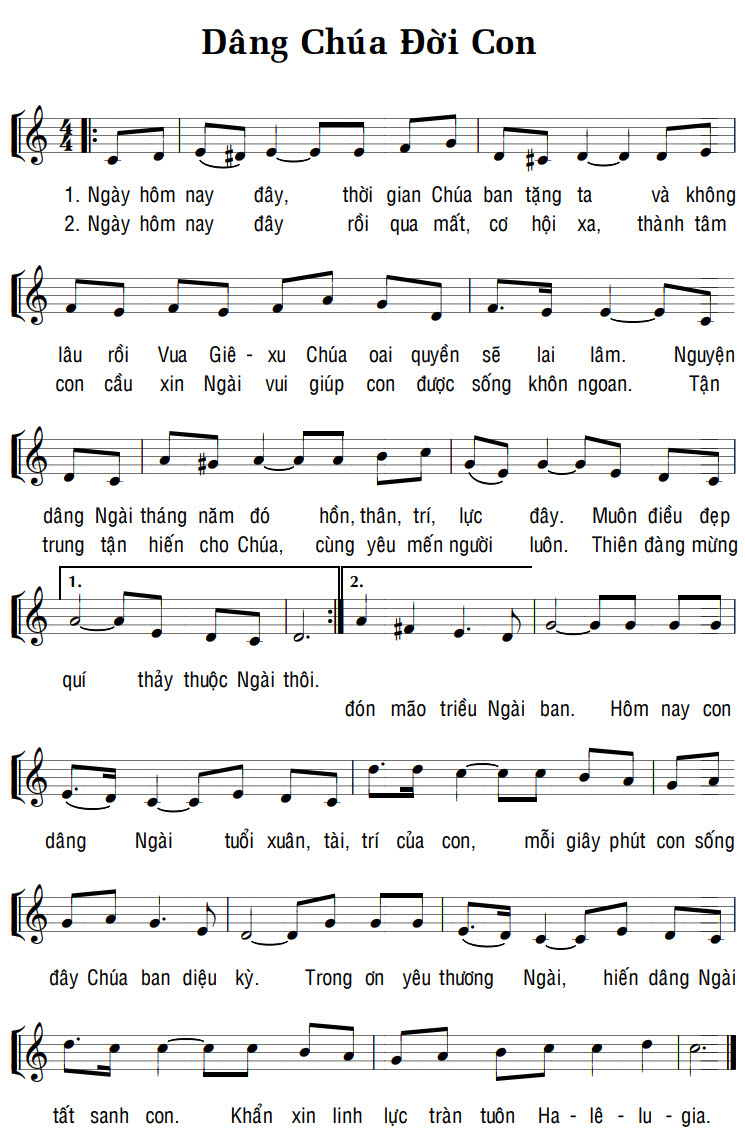 1. Ngày hôm nay đây, thời gian Chúa ban tặng ta và không lâu rồi Vua Giê-xu Chúa oai quyền sẽ lai lâm. Dâng Ngài tháng năm đó hồn, thân, trí, lực đây. Muôn điều đẹp quý thảy thuộc Ngài thôi. Hôm nay con dâng Ngài tuổi xuân, tài, trí của con, mỗi giây phút con sống đây Chúa ban diệu kỳ. Trong ơn yêu thương Ngài, hiến dâng Ngài tất sanh con. Khẩn xin linh lực tràn tuôn Ha-lê-lu-gia. 2. Ngày hôm nay đây rồi qua mất, cơ hội xa, thành tâm con cầu xin Ngài vui giúp con được sống khôn ngoan. Tận trung tận hiến cho Chúa, cùng yêu mến người luôn. Thiên đàng mừng đón mão triều Ngài ban. Hôm nay con dâng Ngài tuổi xuân, tài, trí của con, mỗi giây phút con sống đây Chúa ban diệu kỳ. Trong ơn yêu thương Ngài, hiến dâng Ngài tất sanh con. Khẩn xin linh lực tràn tuôn Ha-lê-lu-gia.