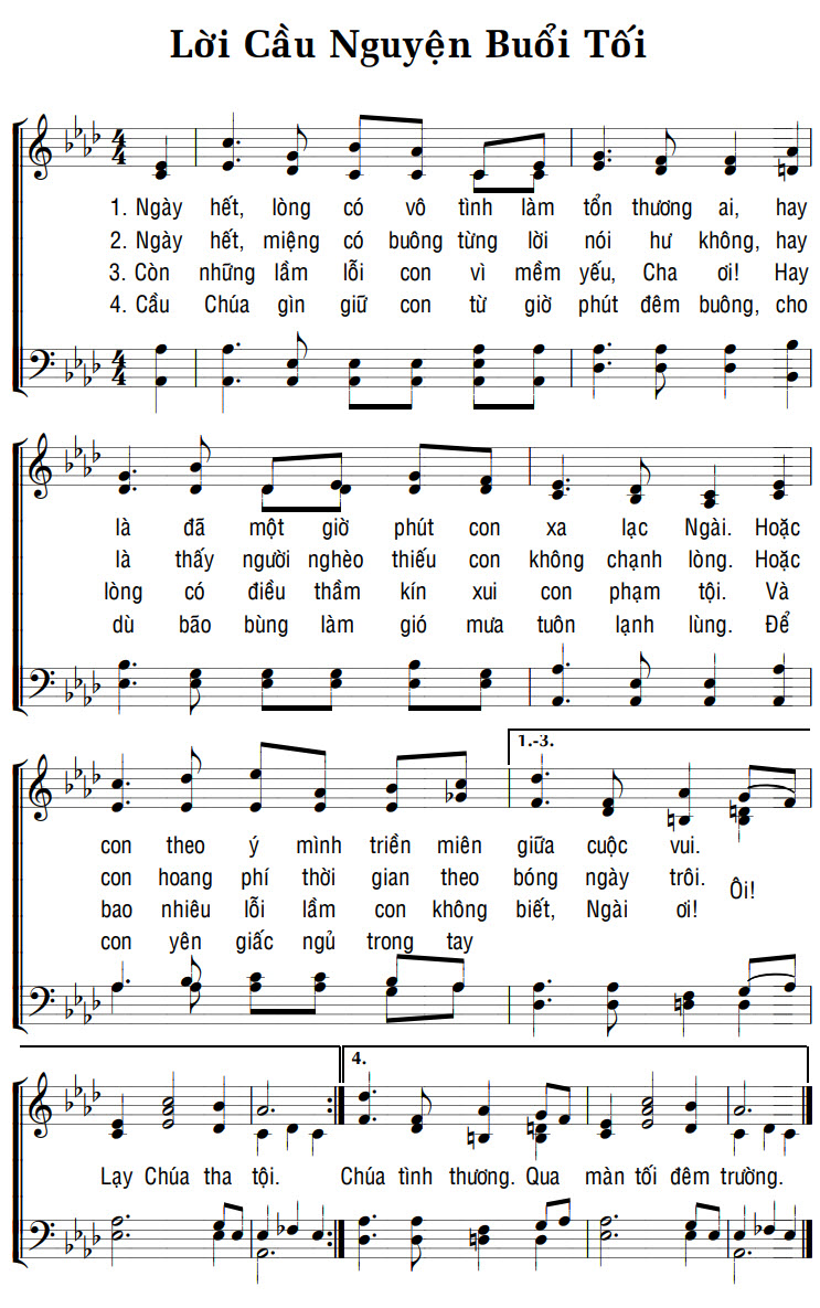 1. Ngày hết, lòng có vô tình làm tổn thương ai, hay là đã một giờ phút con xa lạc Ngài. Hoặc con theo ý mình triền miên giữa cuộc vui. 2. Ngày hết, miệng có buông từng lời nói hư không, hay là thấy người nghèo thiếu con không chạnh lòng. Hoặc con hoang phí thời gian theo bóng ngày trôi. Ôi! 3. Còn những lầm lỗi con vì mềm yếu, Cha ơi! Hay lòng có điều thầm kín xui con phạm tội. Và bao nhiêu lỗi lầm con không biết, Ngài ơi! 4. Cầu Chúa gìn giữ con từ giờ phút đêm buông, cho dù bão bùng làm gió mưa tuôn lạnh lùng. Để con yên giấc ngủ trong tay Lạy Chúa tha tội. Chúa tình thương. Qua màn tối đêm trường.