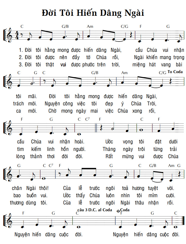 1. Đời tôi hằng mong được hiến dâng Ngài, cầu Chúa vui nhận tôi mãi. cầu Chúa vui nhận hoài. Ước vọng tôi đặt dưới chân Ngài thôi! Của lễ trước ngôi toả hương tuyệt vời. Nguyện hiến dâng cuộc đời. 2. Đời tôi được nên đầy tớ Chúa rồi, Ngài khiến mang trọng trách mới. tìm kiếm linh hồn người. Tháng ngày trôi từng trải bao buồn vui. Ước thấy Chúa luôn nhìn tôi mỉm cười. Nguyện hiến dâng cuộc đời. 3. Đời tôi thật vui được phước trên trời, miệng hát vang bài ca mới. Nguyện công việc tôi đẹp ý Chúa Trời, Chờ mong ngày mai việc Chúa xong rồi, lòng thảnh thơi đời đời. Rất mừng vui được Chúa thương dùng tôi. Của lễ trước ngôi Ngài thâu nhận rồi. Nguyện hiến dâng cuộc đời.