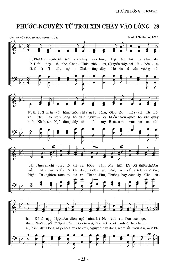 1. Phước - nguyên từ trời xin chảy vào lòng, Bật lên khúc ca chúc ơn Ngài; Suối nhân - từ hằng tuôn chảy ngập dòng, Giục tôi thỏa - vui hát một bài; Nguyện chỉ giáo tôi thi ca bổng trầm Mà lưới lửa cõi thiên thượng hát, Để tôi ngợi Ngọn Ân-điển ngàn tầm, Là Non cứu - ân, Non cực - lạc. 2. Đến đây là nhờ Chân - Chúa phò trì, Nguyền xây cất Ê - bên - ê- xe; Nếu Cha đẹp lòng tôi dám nguyện - kỳ Miền thiên - quốc tôi sớm quay về; Jêsus kiếm tôi khi đang thất - lạc, Từng vơ - vẩn cách xa đường thánh; Suối huyết từ Ngài tuôn chảy rào rạt, Vực tôi khỏi nanhsói hại - hành, 3. Chính tôi đây nợ ơn Chúa nặng dày, Nợ kia cứ vấn - vương mãi hoài; Khẩn-xin Ngài dùng dây ái từ rày Buộc tâm vẩn vơ tôi vào Ngài; Tự - nghiệm tánh tôi ưa xa Thánh - Phụ, Thường hay cách - ly Cha từ- ái; Kính dâng lòng nầy cho Chúa Jê-sus, Nguyện nay đóng niêm ấn thiên đài. A-MEN.