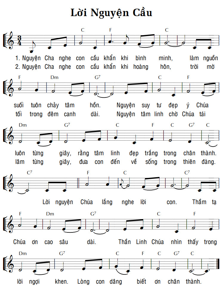 1. Nguyện Cha nghe con cầu khẩn khi bình minh, làm nguồn suối tuôn chảy tâm hồn. Nguyện suy tư đẹp ý Chúa luôn từng giây, rằng tâm linh đẹp trắng trong chân thành. 2. Nguyện Cha nghe con cầu khẩn khi hoàng hôn, trời mờ tối trong đêm canh dài. Nguyện tâm linh chờ Chúa tái lâm từng giây, đưa con đến về sống trong thiên đàng. Điệp khúc: Lời nguyện Chúa lắng nghe lời con. Thầm tạ Chúa ơn cao sâu dài. Thần Linh Chúa nhìn thấy trong lời ngợi khen. Lòng con dâng biết ơn chân thành.