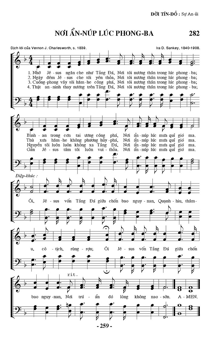 1. Nhờ Jê-sus ngăn che như Tảng Đá, Nơi tôi nương thân trong lúc phong - ba; Bình an trong cơn tai ương công phá, Nơi ẩn núp lúc mưa quỉ gió ma. 2. Ngày đêm Jê-sus che tôi yên thỏa, Nơi tôi nương thân trong lúc phong - ba; Thù xưa hăm he không phương hủy phá, Nơi ẩn núp lúc mưa quỉ gió ma. 3. Cuồng phong vây tôi hăm he công phá, Nơi tôi nương thân trong lúc phong - ba; Nguyễn tôi luôn luôn không xa Tảng Đá, Nơi ẩn núp lúc mưa quỉ gió ma. 4. Thật an ninh thay nương trên Tảng Đá, Nơi tôi nương thân trong lúc phong - ba; Gần Jê-sus tâm tôi luôn vui thỏa. Nơi ẩn núp lúc mưa quỉ gió ma. Điệp khúc: Ôi, Jê-sus vốn Tảng Đá giữa chốn bao nguy nan, Quạnh hiu, thâm-u, cô tịch, rùng rợn; Ôi Jê-sus vốn Tảng Đá giữa chốn bao nguy-nan, Nơi trú ẩn đó lòng không nao sờn. A-MEN.