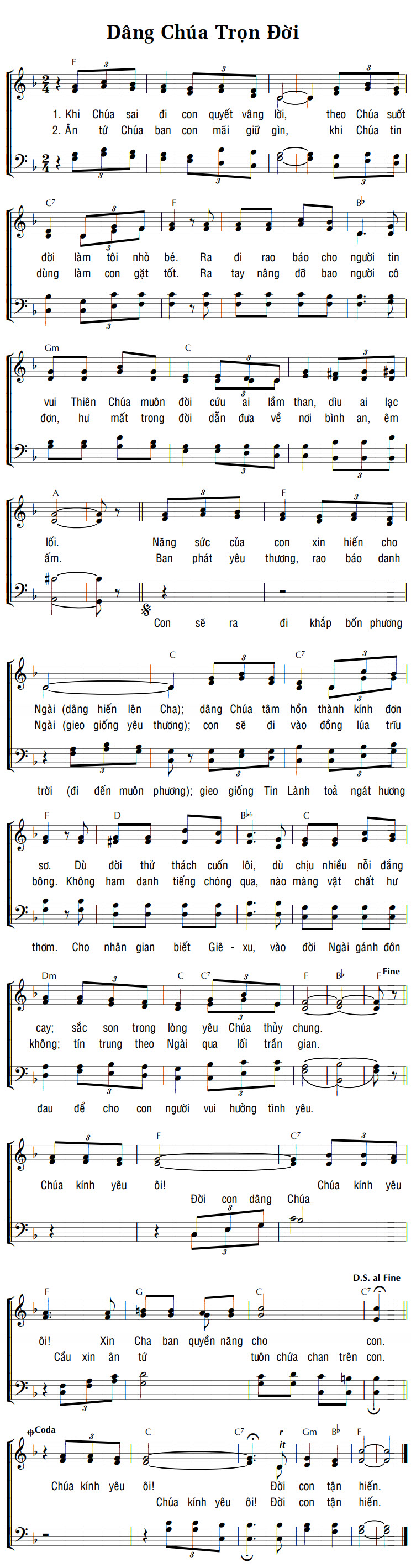 1. Khi Chúa sai đi con quyết vâng lời, theo Chúa suốt đời làm tôi nhỏ bé. Ra đi rao báo cho người tin vui Thiên Chúa muôn đời cứu ai lầm than, dìu ai lạc lối. Năng sức của con xin hiến cho Ngài (dâng hiến lên Cha); dâng Chúa tâm hồn thành kính đơn sơ. Dù đời thử thách cuốn lôi, dù chịu nhiều nỗi đắng cay; sắc son trong lòng yêu Chúa thủy chung. đau để cho con người vui hưởng tình yêu. 2. Ân tứ Chúa ban con mãi giữ gìn, khi Chúa tin dùng làm con gặt tốt. Ra tay nâng đỡ bao người cô đơn, hư mất trong đời dẫn đưa về nơi bình an, êm ấm. Ban phát yêu thương, rao báo danh Ngài (gieo giống yêu thương); con sẽ đi vào đồng lúa trĩu trời (đi đến muôn phương); gieo giống Tin Lành toả ngát hương bông. Không ham danh tiếng chóng qua, nào màng vật chất hư thơm. Cho nhân gian biết Giê-Xu, vào đời Ngài gánh đớn không; tín trung theo Ngài qua lối trần gian. Điệp khúc: Chúa kính yêu ôi! Đời con dâng Chúa Chúa kính yêu ôi! Xin Cha ban quyền năng cho con. Cầu xin ân tứ tuôn chứa chan trên con. Chúa kính yêu ôi! Đời con tận hiến. Chúa kính yêu ôi! Đời con tận hiến.