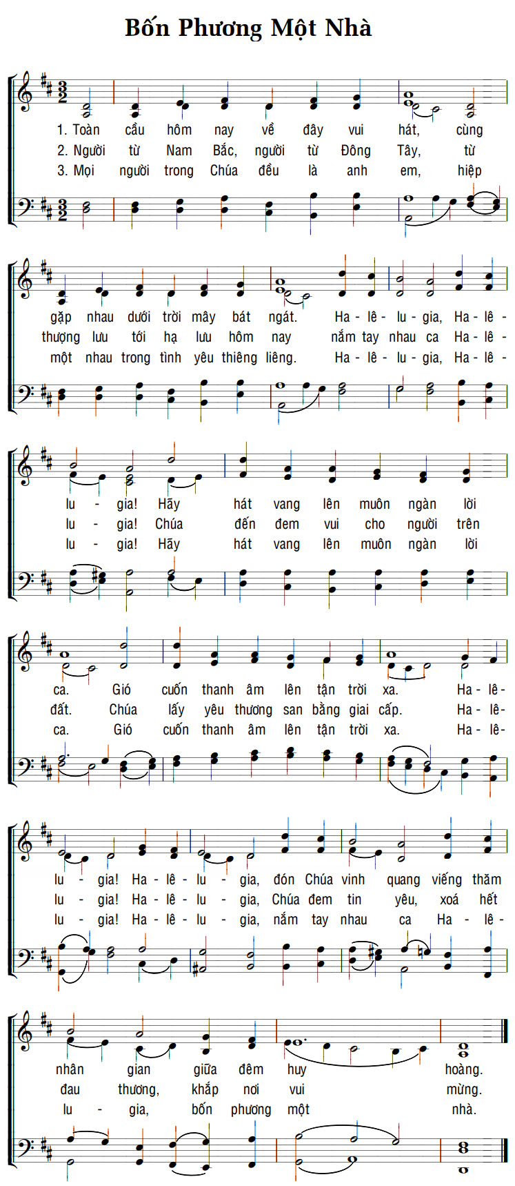 1. Toàn cầu hôm nay về đây vui hát, cùng gặp nhau dưới trời mây bát ngát. Ha-lê-lu-gia, Ha-lê-lu-gia! Hãy hát vang lên muôn ngàn lời ca. Gió cuốn thanh âm lên tận trời xa. Ha-lê-lu-gia! Ha-lê-lu-gia, đón Chúa vinh quang viếng thăm nhân gian giữa đêm huy hoàng. 2. Người từ Nam Bắc, người từ Đông Tây, từ thượng lưu tới hạ lưu hôm nay nắm tay nhau ca Ha-lê-lu-gia! Chúa đến đem vui cho người trên đất. Chúa lấy yêu thương san bằng giai cấp. Ha-lê-lu-gia! Ha-lê-lu-gia, Chúa đem tin yêu, xoá hết đau thương, khắp nơi vui mừng. 3. Mọi người trong Chúa đều là anh em, hiệp một nhau trong tình yêu thiêng liêng. Ha-lê-lu-gia, Ha-lê-lu-gia! Hãy hát vang lên muôn ngàn lời ca. Gió cuốn thanh âm lên tận trời xa. Ha-lê-lu-gia! Ha-lê-lu-gia, nắm tay nhau ca Ha-lê-lu-gia, bốn phương một nhà.
