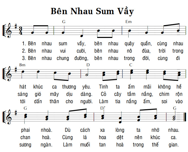 1. Bên nhau sum vầy, bên nhau quây quần, cùng nhau hát khúc ca thương yêu. Tình ta ấm mãi không hề phai nhoà. Dù cách xa lòng ta nhớ nhau. 2. Bên nhau vui cười, bên nhau nô đùa, trời trong sáng gió mây dịu dàng. Cỏ cây tắm nắng, chim rộn chan hoà. Cùng lá hoa dệt nên khúc ca. 3. Bên nhau chung đường, bên nhau trong đời, cùng đi tới dấn thân cho người. Làm tia nắng ấm, soi vào sương ngàn. Làm muối tan hoà trong thế gian.