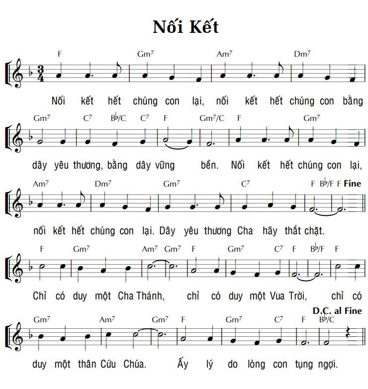 1. Nối kết hết chúng con lại, nối kết hết chúng con bằng dây yêu thương, bằng dây vững bền. Nối kết hết chúng con lại, nối kết hết chúng con lại. Dây yêu thương Cha hãy thắt chặt. Điệp khúc: Chỉ có duy một Cha Thánh, chỉ có duy một Vua Trời, chỉ có duy một thân Cứu Chúa. Ấy lý do lòng con tụng ngợi.