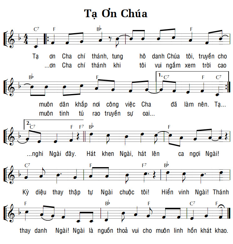 1. Tạ ơn Cha chí thánh, tung hô danh Chúa tôi, truyền cho muôn dân khắp nơi công việc Cha đã làm nên. Tạ ơn Cha chí thánh khi tôi vui ngắm xem trời cao. Kỳ diệu thay thập tự Ngài chuộc tôi! Hiển vinh Ngài! Thánh thay danh Ngài! Ngài là nguồn thoả vui cho muôn linh hồn khát khao. 2. Tạ ơn Cha chí thánh, tung hô danh Chúa tôi, truyền cho muôn tinh tú rao truyền sự oai nghi Ngài đây. Hát khen Ngài, hát lên ca ngợi Ngài! Kỳ diệu thay thập tự Ngài chuộc tôi! Hiển vinh Ngài! Thánh thay danh Ngài! Ngài là nguồn thoả vui cho muôn linh hồn khát khao.