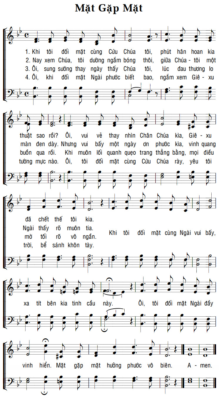 1. Khi tôi đối mặt cùng Cứu Chúa tôi, phút hân hoan kia thuật sao rồi? Ôi, vui vẻ thay nhìn Chân Chúa kìa, Giê-xu đã chết thế tôi kia. Khi tôi đối mặt cùng Ngài vui bấy, xa tít bên kia tinh cầu này. Ôi, tôi đối mặt Ngài đầy vinh hiển. Mặt gặp mặt hưởng phước vô biên. A-men. 2. Nay xem Chúa, tôi dường ngắm bóng thôi, giữa Chúa - tôi một màn đen dày. Nhưng vui bấy một ngày ơn phước kìa, vinh quang Ngài thấy rõ muôn tia. Khi tôi đối mặt cùng Ngài vui bấy, xa tít bên kia tinh cầu này. Ôi, tôi đối mặt Ngài đầy vinh hiển. Mặt gặp mặt hưởng phước vô biên. A-men. 3. Ôi, sung sướng thay ngày thấy Chúa tôi, lúc đau thương lo buồn qua rồi. Khi muôn lối quanh quẹo trang thẳng bằng, mọi điều mờ tối rõ vô ngần. Khi tôi đối mặt cùng Ngài vui bấy, xa tít bên kia tinh cầu này. Ôi, tôi đối mặt Ngài đầy vinh hiển. Mặt gặp mặt hưởng phước vô biên. A-men. 4. Ôi, khi đối mặt Ngài phước biết bao, ngắm xem Giê-xu tưởng mực nào. Ôi, tôi đối mặt cùng Cứu Chúa rày, yêu tôi trời, bể sánh khôn tày. Khi tôi đối mặt cùng Ngài vui bấy, xa tít bên kia tinh cầu này. Ôi, tôi đối mặt Ngài đầy vinh hiển. Mặt gặp mặt hưởng phước vô biên. A-men.