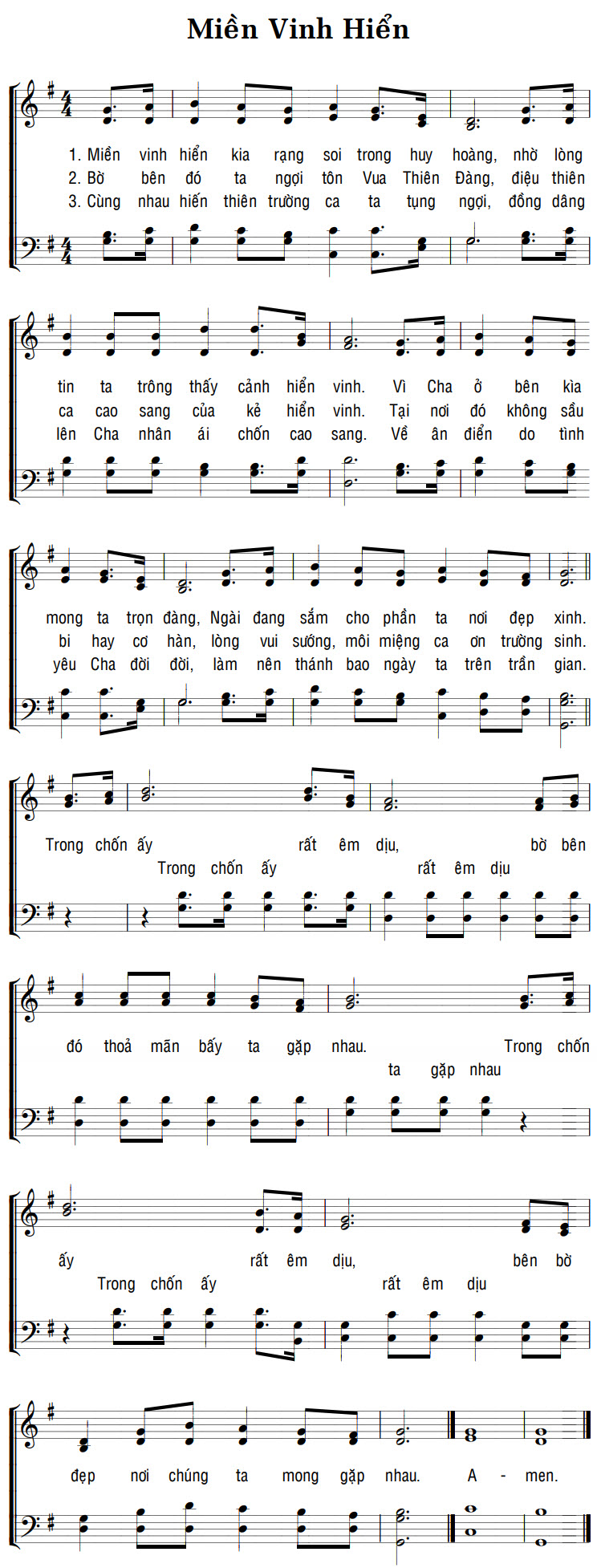 1. Miền vinh hiển kia rạng soi trong huy hoàng, nhờ lòng tin ta trông thấy cảnh hiển vinh. Vì Cha ở bên kìa mong ta trọn đàng, Ngài đang sắm cho phần ta nơi đẹp xinh. 2. Bờ bên đó ta ngợi tôn Vua Thiên Đàng, điệu thiên ca cao sang của kẻ hiển vinh. Tại nơi đó không sầu bi hay cơ hàn, lòng vui sướng, môi miệng ca ơn trường sinh. 3. Cùng nhau hiến thiên trường ca ta tụng ngợi, đồng dâng lên Cha nhân ái chốn cao sang. Về ân điển do tình yêu Cha đời đời, làm nên thánh bao ngày ta trên trần gian. Điệp khúc: Trong chốn ấy rất êm dịu, bờ bên đó thoả mãn bấy ta gặp nhau. Trong chốn ấy rất êm dịu, bên bờ đẹp nơi chúng ta mong gặp nhau. A - men.