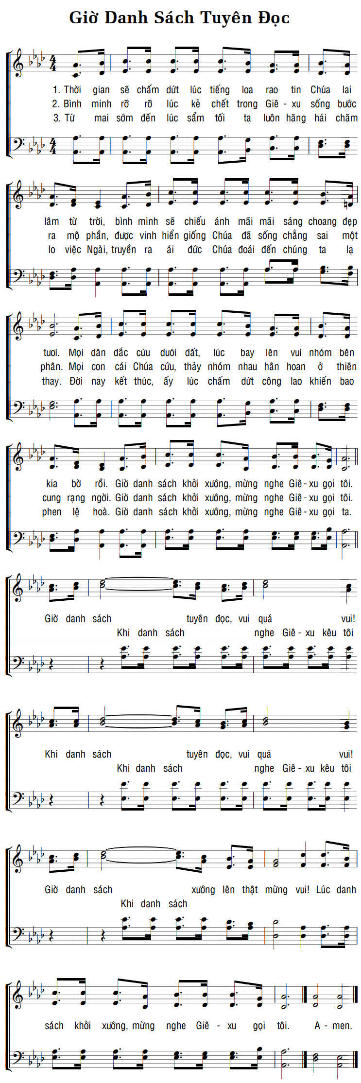 1. Thời gian sẽ chấm dứt lúc tiếng loa rao tin Chúa lai lâm từ trời, bình minh sẽ chiếu ánh mãi mãi sáng choang đẹp tươi. Mọi dân đắc cứu dưới đất, lúc bay lên vui nhóm bên kia bờ rồi. Giờ danh sách khởi xướng, mừng nghe Giê-xu gọi tôi. 2. Bình minh rõ rỡ lúc kẻ chết trong Giê-xu sống bước ra mộ phần, được vinh hiển giống Chúa đã sống chẳng sai một phân. Mọi con cái Chúa cứu, thảy nhóm nhau hân hoan ở thiên cung rạng ngời. Giờ danh sách khởi xướng, mừng nghe Giê-xu gọi tôi. 3. Từ mai sớm đến lúc sẩm tối ta luôn hăng hái chăm lo việc Ngài, truyền ra ái đức Chúa đoái đến chúng ta thay. Đời nay kết thúc, ấy lúc chấm dứt công lao khiến bao phen lệ hoà. Giờ danh sách khởi xướng, mừng nghe Giê-xu gọi ta. Điệp khúc: Giờ danh sách tuyên đọc, vui quá vui! Khi danh sách nghe Giê-xu kêu tôi. Giờ danh sách tuyên đọc, vui quá vui! Khi danh sách nghe Giê-xu kêu tôi. Giờ danh sách xướng lên thật mừng vui! Lúc danh sách khởi xướng, mừng nghe Giê-xu gọi tôi. A - men.