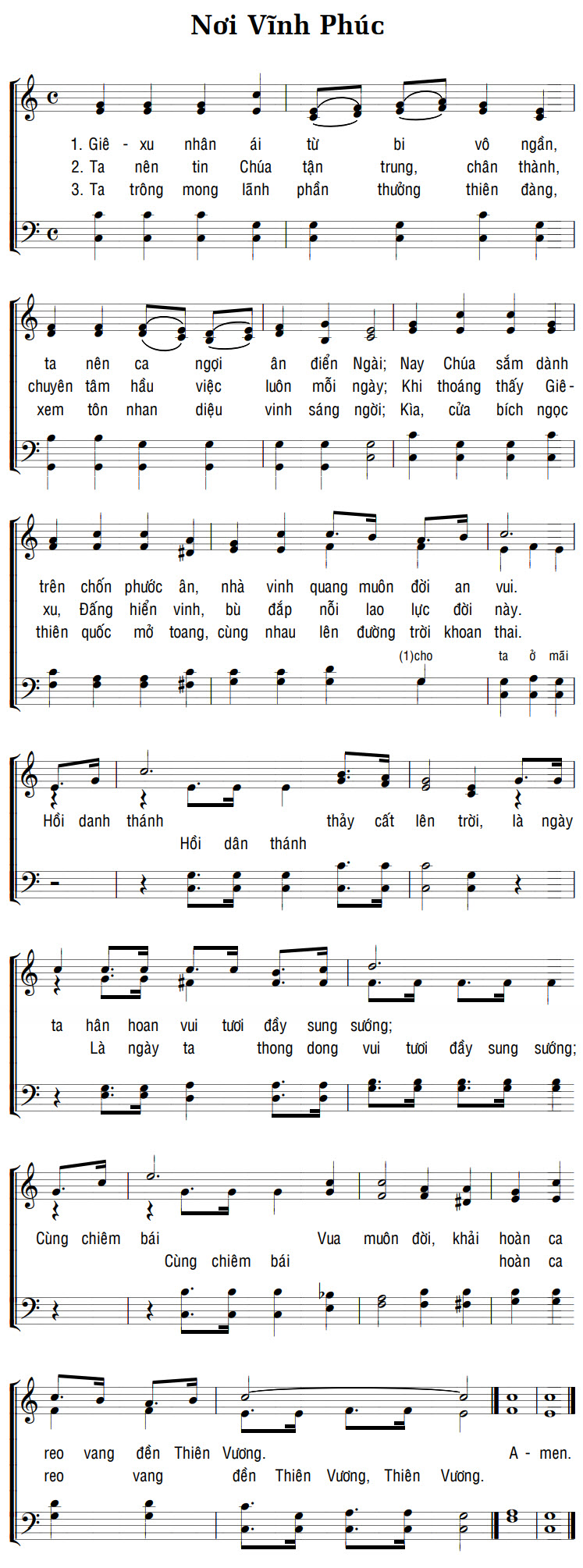 1. Giê-xu nhân ái từ bi vô ngần, ta nên ca ngợi ân điển Ngài; Nay Chúa sắm dành trên chốn phước ân, nhà vinh quang muôn đời an vui. 2. Ta nên tin Chúa tận trung, chân thành, chuyên tâm hầu việc luôn mỗi ngày; Khi thoáng thấy Giê- xu, Đấng hiển vinh, bù đắp nỗi lao lực đời này. 3. Ta trông mong lãnh phần thưởng thiên đàng, xem tôn nhan diệu vinh sáng ngời; Kìa, cửa bích ngọc thiên quốc mở toang, cùng nhau lên đường trời khoan thai. Điệp khúc: (1)cho ta ở mãi Hồi danh thánh thảy cất lên trời, là ngày Hồi dân thánh ta hân hoan vui tươi đầy sung sướng; Là ngày ta thong dong vui tươi đầy sung sướng; Cùng chiêm bái Vua muôn đời, khải hoàn ca Cùng chiêm bái hoàn ca reo vang đền Thiên Vương. reo vang đền Thiên Vương, Thiên Vương. A - men.