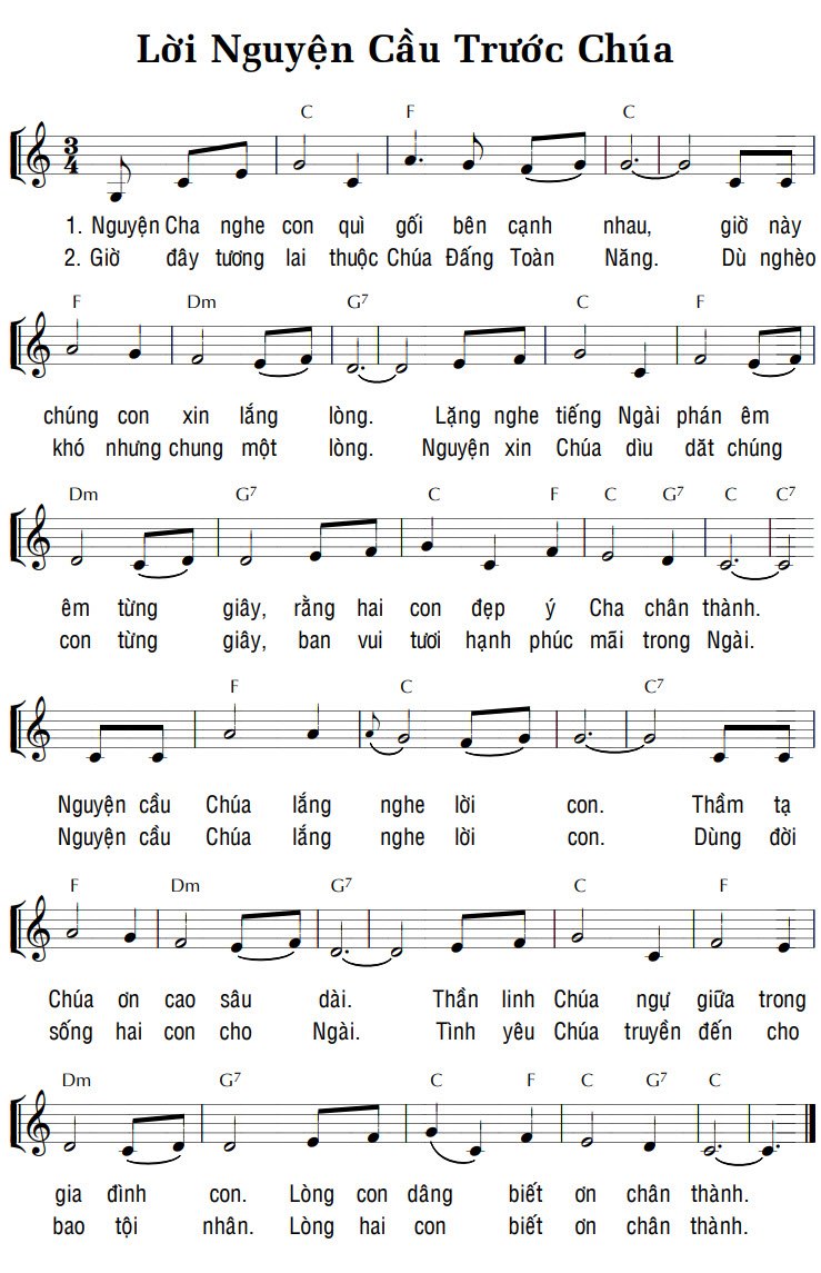 1. Nguyện Cha nghe con quì gối bên cạnh nhau, giờ này chúng con xin lắng lòng. Lặng nghe tiếng Ngài phán êm từng giây, rằng hai con đẹp ý Cha chân thành. Nguyện cầu Chúa lắng nghe lời con. Thầm tạ Chúa ơn cao sâu dài. Thần linh Chúa ngự giữa trong gia đình con. Lòng con dâng biết ơn chân thành. 2. Giờ đây tương lai thuộc Chúa Đấng Toàn Năng. Dù nghèo khó nhưng chung một lòng. Nguyện xin Chúa dìu dắt chúng con từng giây, ban vui tươi hạnh phúc mãi trong Ngài. Nguyện cầu Chúa lắng nghe lời con. Dùng đời sống hai con cho Ngài. Tình yêu Chúa truyền đến cho bao tội nhân. Lòng hai con biết ơn chân thành.