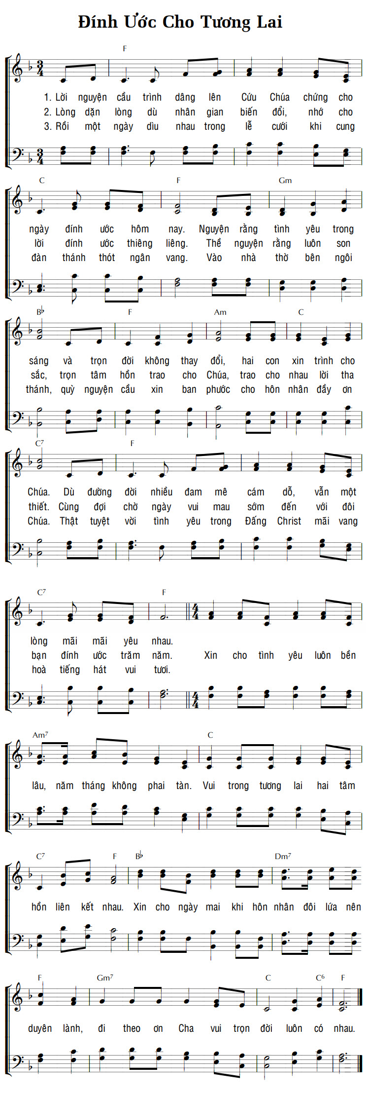 1. Lời nguyện cầu trình dâng lên Cứu Chúa chứng cho ngày đính ước hôm nay. Nguyện rằng tình yêu trong sáng và trọn đời không thay đổi, hai con xin trình cho Chúa. Dù đường đời nhiều đam mê cám dỗ, vẫn một lòng mãi mãi yêu nhau. Xin cho tình yêu luôn bền lâu, năm tháng không phai tàn. Vui trong tương lai hai tâm hồn liên kết nhau. Xin cho ngày mai khi hôn nhân đôi lứa nên duyên lành, đi theo ơn Cha vui trọn đời luôn có nhau. 2. Lòng dặn lòng dù nhân gian biến đổi, nhớ cho lời đính ước thiêng liêng. Thề nguyện rằng luôn sắc, trọn tâm hồn trao cho Chúa, trao cho nhau lời tha thiết. Cùng đợi chờ ngày vui mau sớm đến với đôi bạn đính ước trăm năm. Vui trong tương lai hai tâm hồn liên kết nhau. Xin cho ngày mai khi hôn nhân đôi lứa nên duyên lành, đi theo ơn Cha vui trọn đời luôn có nhau. 3. Rồi một ngày dìu nhau trong lễ cưới khi cung đàn thánh thót ngân vang. Vào nhà thờ bên ngôi thánh, quỳ nguyện cầu xin ban phước cho hôn nhân đầy ơn Chúa. Thật tuyệt vời tình yêu trong Đấng Christ mãi vang hoà tiếng hát vui tươi. Vui trong tương lai hai tâm hồn liên kết nhau. Xin cho ngày mai khi hôn nhân đôi lứa nên duyên lành, đi theo ơn Cha vui trọn đời luôn có nhau.