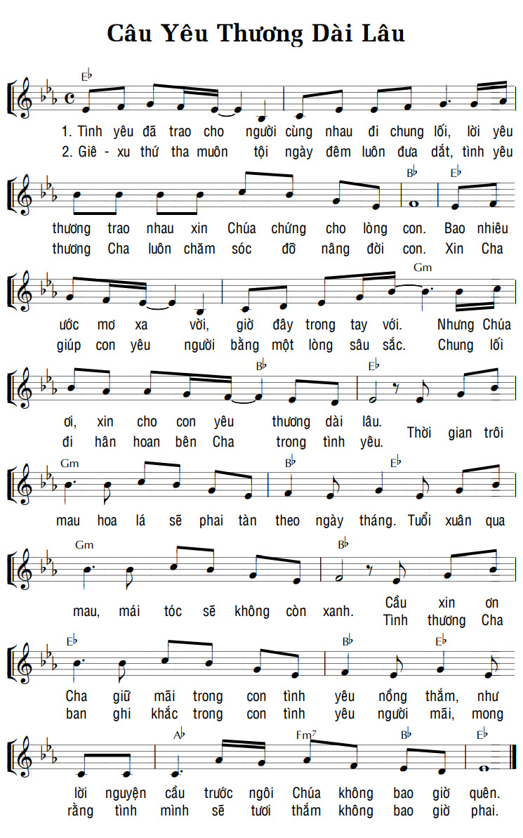 1. Tình yêu đã trao cho người cùng nhau đi chung lối, lời yêu thương trao nhau xin Chúa chứng cho lòng con. Bao nhiêu ước mơ xa vời, giờ đây trong tay với. Nhưng Chúa ơi, xin cho con yêu thương dài lâu. Thời gian trôi mau hoa lá sẽ phai tàn theo ngày tháng. Tuổi xuân qua mau, mái tóc sẽ không còn xanh. Cầu xin ơn Tình thương Cha Cha giữ mãi trong con tình yêu nồng thắm, như lời nguyện cầu trước ngôi Chúa không bao giờ quên. 2. Giê-xu thứ tha muôn tội ngày đêm luôn đưa dắt, tình yêu thương Cha luôn chăm sóc đỡ nâng đời con. Xin Cha giúp con yêu người bằng một lòng sâu sắc. Chung lối đi hân hoan bên Cha trong tình yêu. Thời gian trôi mau hoa lá sẽ phai tàn theo ngày tháng. Tuổi xuân qua mau, mái tóc sẽ không còn xanh. Cầu xin ơn Tình thương Cha Cha giữ mãi trong con tình yêu người mãi, mong rằng tình mình sẽ tươi thắm không bao giờ phai.