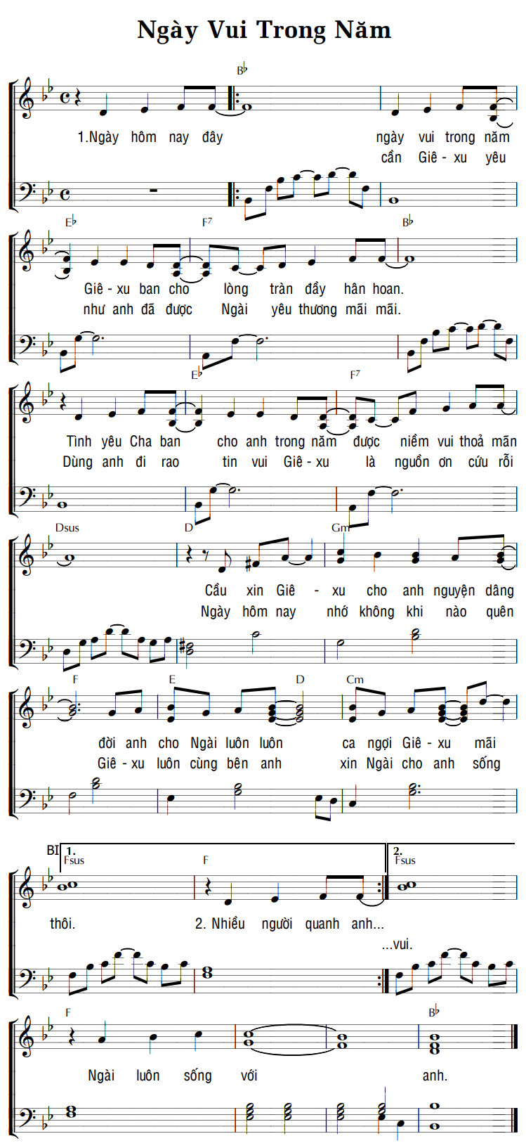 1. Ngày hôm nay đây ngày vui trong năm cần Giê-xu yêu Giê-xu ban cho lòng tràn đầy hân hoan. như anh đã được Ngài yêu thương mãi mãi. Tình yêu Cha ban cho anh trong năm được niềm vui thoả mãn Dùng anh đi rao tin vui Giê - xu là nguồn ơn cứu rỗi Cầu xin Giê - xu cho anh nguyện dâng Ngày hôm nay nhớ không khi nào quên đời anh cho Ngài luôn luôn ca ngợi Giê-xu mãi Giê-xu luôn cùng bên anh xin Ngài cho anh sống thôi. 2. Nhiều người quanh anh... ...vui. Ngài luôn sống với anh.