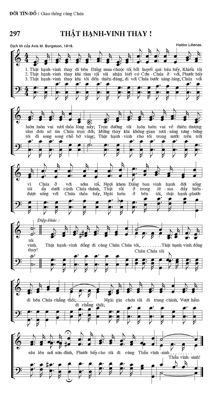 1. Thật hạnh-vinh thay đi bên Đấng mua chuộc tôi bởi huyết quí-báu bấy, Khiến tôi luôn luôn vui tươi thỏa lòng nầy; vì Chúa ở với sớm tối, Ngợi khen Đấng ban vinh hạnh đời sống được sống với Chúa thỏa bấy, Ngài luôn ở bên tôi, thật hạnh-phước 2. Thật hạnh-vinh thay khi tăm-tối tôi nhận biết có Cứu-Chúa ở với, Phước bấy tâm đơn sơ tin Chúa trọn đời; tôi ẩn dưới cánh Chúa thánh, Thật tôi ở trong Jê-sus đầy hiển- 3. Thật hạnh-vinh thay khi tôi đến thiên-đàng, đi với Chúa bước sáng-láng, Chúa với tôi đi song song chỗ bờ vàng; Thật hạnh-vinh cho tôi trong nước trên trời Điệp khúc: Thật hạnh-vinh đồng đi cùng Chân Chúa tôi,....... Thật hạnh-vinh đồng Chân-Chúa tôi đi bên Chúa chẳng thôi;....... Ngài gìn chơn tôi đi trung chính, Vượt hầm đi chẳng thôi; sâu lên nơi sơn-đỉnh, Phước bấy cho tôi đi cùng Thần vĩnh-sinh... Thần vĩnh-sinh!