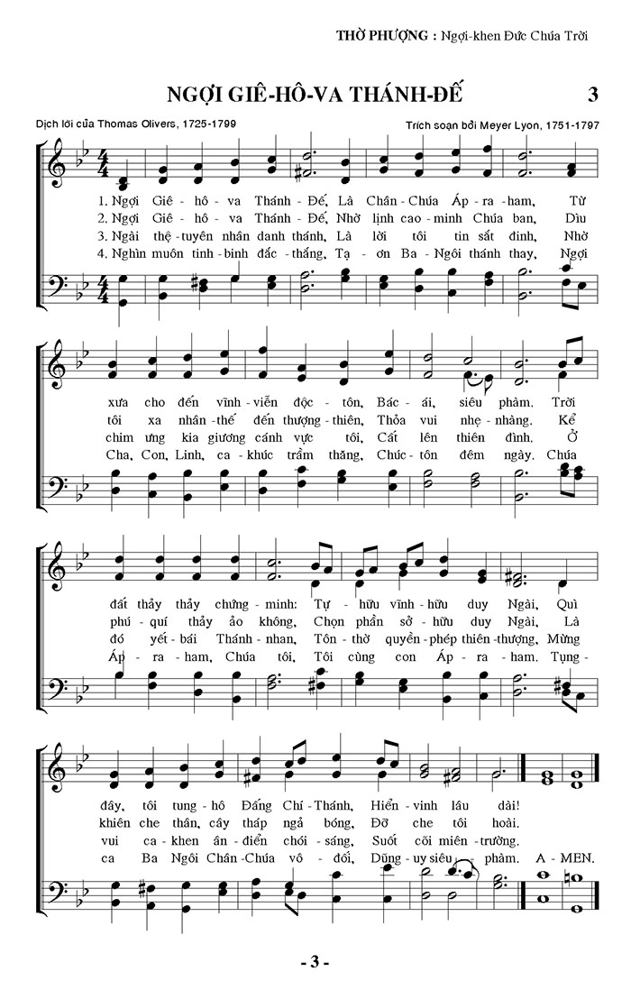 1. Ngợi Giê-hô-va Thánh-Đế, Là Chân-Chúa Áp-ra-ham, Từ xưa cho đến vĩnh-viễn độc-tôn, Bác-ái, siêu phàm. Trời đất thảy thảy chứng-minh: Tự-hữu vĩnh-hữu duy Ngài, Quì đây, tôi tung-hô Đấng Chí-Thánh, Hiển-vinh lâu dài! 2. Ngợi Giê-hô-va Thánh-Đế, Nhờ lịnh cao-minh Chúa ban, Dìu tôi xa nhân-thế đến thượng-thiên, Thỏa vui nhẹ-nhàng. Kể phú quí thảy ảo không. Chọn phần sở-hữu duy Ngài, Là khiên che thân, cây tháp ngả bóng, Đỡ che tôi hoài. 3. Ngài thệ-tuyên nhân danh thánh, Là lời tôi tin sắt đinh, Nhờ chim ưng kia giương cánh vực tôi, Cất lên thiên đình. Ở đó yết-bái Thánh-nhan, Tôn-thờ quyền-phép thiên-thượng, Mừng vui ca-khen ân-điển chói-sáng, Suốt cõi miên-trường. 4. Nghìn muôn tinh-binh đắc-thắng, Tạ ơn Ba-Ngôi thánh thay, Ngợi Cha, Con, Linh, ca khúc trầm thăng, Chúc-tôn đêm ngày. Chúa Áp-ra-ham, Chúa tôi, Tôi cùng con Áp-ra-ham. Tụng ca Ba Ngôi Chân-Chúa vô-đối, Dũng-uy siêu phàm. A-MEN.