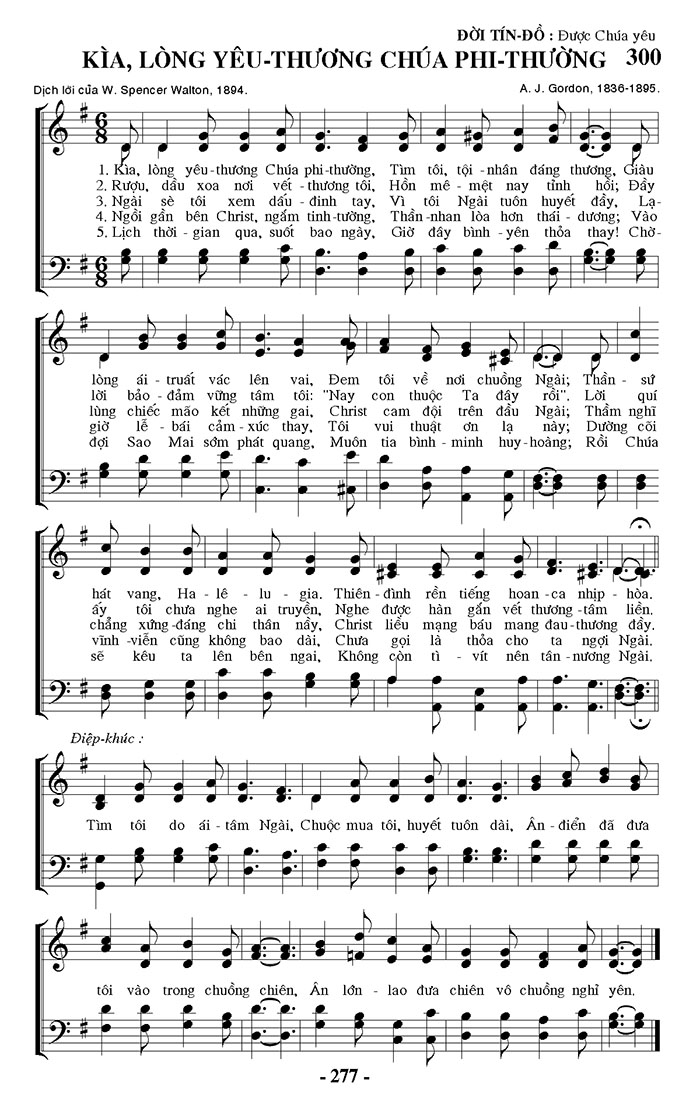 1. Kìa, lòng yêu - thương Chúa phi thường, Tìm tôi, tội nhân đáng thương, Giàu lòng ái truất vác lên vai, Đem tôi về nơi chuồng Ngài; Thần Sứ hát vang, Ha lê lu gia. Thiên - đình rền tiếng hoan ca nhịp hòa. 2. Rượu, dầu xoa nơi vết thương tôi, Hồn mê mệt nay tỉnh hồi; Đầy lời bảo đảm vững tâm tôi: "Nay con thuộc Ta đây rồi". Lời quí ấy tôi chưa nghe ai truyền, Nghe được hàn gắn vết thương tâm liền. 3. Ngài sè tôi xem dấu - đỉnh tay, Vì tôi Ngài tuôn huyết đầy, La- lùng chiếc mão kết những gai, Christ cam đội trên đầu Ngài, Thầm nghĩ chẳng xứng đáng chỉ thân nầy, Christ liễu mạng báu mang đau thương đầy. 4. Ngồi gần bên Christ, ngắm tinh tường, Thần-nhan lòa hơn thái dương; Vào giờ lễ bái cảm - xúc thay, Tôi vui thuật ơn lạ này; Dường cõi vĩnh viễn cũng không bao dài, Chưa gọi là thỏa cho ta ngợi Ngài. 5. Lịch thời gian qua, suốt bao ngày, Giờ đây bình yên thỏa thay! Chờ- đợi Sao Mai sớm phát quang, Muôn tỉa bình minh huy hoàng; Rồi Chúa sẽ kêu ta lên bên ngai, Không còn tì vít nên tấn - nương Ngài. Điệp khúc: Tìm tôi do ái - tâm Ngài, Chuộc mua tôi, huyết tuôn dài, Ân - điển đã đưa tôi vào trong chuồng chiên, Ân lớn lao đưa chiên vô chuồng nghỉ yên.