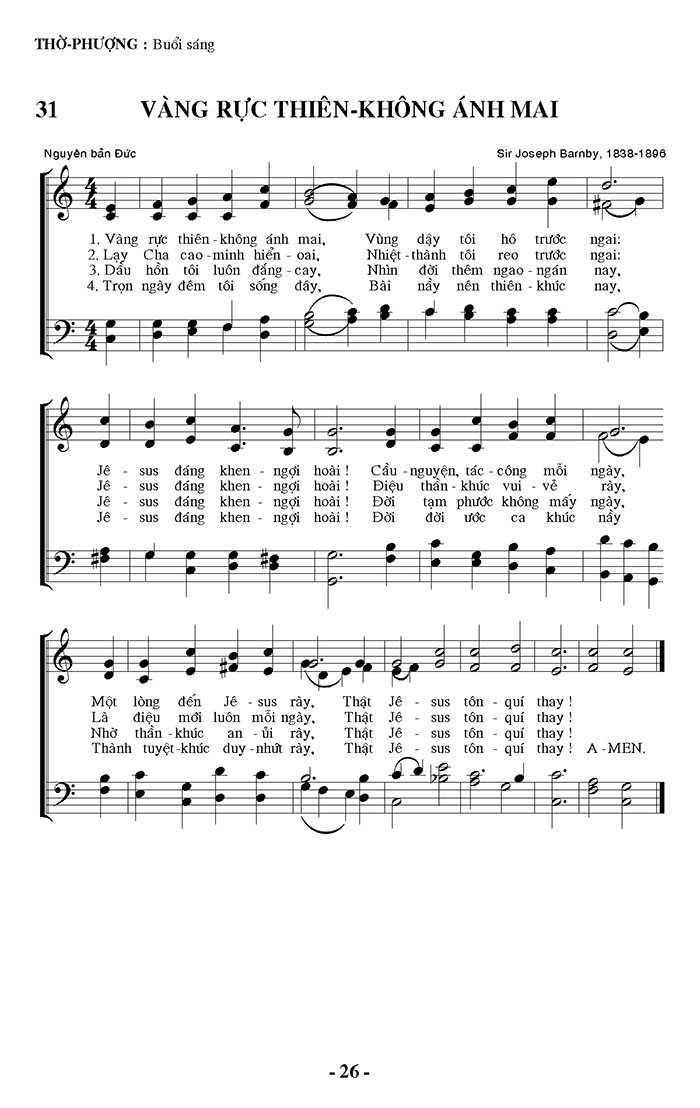 1. Vàng rực thiên - không ánh mai, Vùng dậy tôi hô trước ngai: Jê - sus đáng khen - ngợi hoài! Cầu - nguyện, tác - công mỗi ngày, Một lòng đến Jê - sus rày, Thật Jê - sus tôn - quí thay! 2. Lạy Cha cao - minh hiển - oai, Nhiệt - thành tôi reo trước ngai: Jê - sus đáng khen - ngợi hoài! Điệu thần - khúc vui vẻ rày, Là điệu mới luôn mỗi ngày, Thật Jê - sus tôn - quí thay! 3. Dầu hồn tôi luôn đắng - cay, Nhìn đời thêm ngao - ngán nay, Jê - sus đáng khen - ngợi hoài! Đời tạm phước không mấy ngày, Nhờ thần - khúc an - ủi rày, Thật Jê - sus tôn - quí thay! 4. Trọn ngày đêm tôi sống đây, Bài nầy nên thiên - khúc nay, Jê - sus đáng khen - ngợi hoài! Đời đời ước ca khúc nầy, Thành tuyệt - khúc duy - nhứt rày, Thật Jê - sus tôn - quí thay! A-MEN.