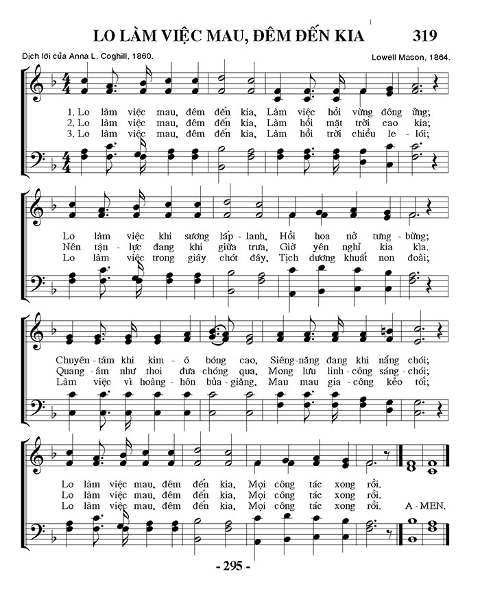 1. Lo làm việc mau, đêm đến kia, Làm việc hồi vừng đông ửng; Lo làm việc khi sương lấp - lanh, Hồi hoa nở tưng - bừng; Chuyên - tâm khi kim - ô bóng cao, Siêng - năng đang khi nắng chói; Lo làm việc mau, đêm đến kia, Mọi công tác xong rồi. 2. Lo làm việc mau, đêm đến kia, Làm hồi mặt trời cao kia; Nên tận lực đang khi giữa trưa, Giờ yên nghỉ kia kìa. Quang - âm như thoi đưa chóng qua, Mong lưu linh - công sáng - chói; Lo làm việc mau, đêm đến kia, Mọi công tác xong rồi. 3. Lo làm việc mau, đêm đến kia, Làm hồi trời chiều le - lói; Lo làm việc trong giây chót đây, Tịch dương khuất non đoài; Làm việc vì hoàng - hôn bủa giăng, Mau mau gia - công kẻo tối; Lo làm việc mau, đêm đến kia, Mọi công tác xong rồi. Điệp khúc: A-MEN.