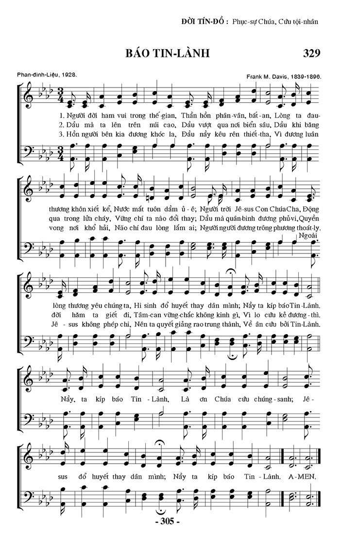 1. Người đời ham vui trong thế gian, Thần hồn phân vân, bất an, Lòng ta đau-thương khôn xiết kể, Nước mắt tuôn dầm ủ ê; Người trời Jê-sus Con Chúa Cha, Động lòng thương yêu chúng ta, Hi sinh đổ huyết thay dân mình; 2. Dầu mà ta lên trên núi cao, Dầu vượt qua nơi biển sâu, Dầu khi băng qua trong lửa cháy, Vững chí ta nào đổi thay; Dầu mà quân-binh đương phủ-vi, Quyền đời hăm ta giết đi, Tâm-can vững chắc không kinh gì, Vì lo cứu kẻ đương - thì. 3. Hồn người bên kia đương khóc la, Đầu nầy kêu rên thiết tha, Vì đương luân vong nơi khổ hải, Não chí đau lòng lắm ai; Người người đương trông phương thoát-ly. Ngoài Jê-sus không phép chi, Nên ta quyết giảng rao trung thành, Về ân cứu bởi Tin Lành. Điệp khúc: Nầy, ta kíp báo Tin Lành, Là ơn Chúa cứu chúng - sanh; Jê-sus đổ huyết thay dân mình; Nầy ta kíp báo Tin Lành. A-MEN.
