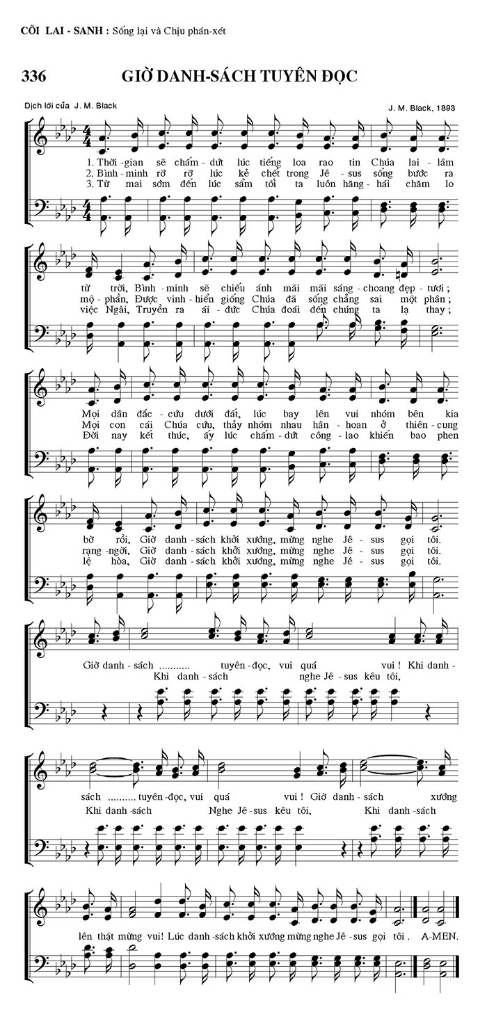 1. Thời gian sẽ chấm dứt lúc tiếng loa rao tin Chúa lai lâm từ trời, Bình minh sẽ chiếu ánh mãi mãi sáng choang đẹp tươi; Mọi dân đắc cứu dưới đất, lúc bay lên vui nhóm bên kia bờ rồi, Giờ danh sách khởi xướng, mừng nghe Jê-sus gọi tôi. 2. Bình minh rỡ rỡ lúc kẻ chết trong Jê-sus sống bước ra mộ phần, Được vinh hiển giống Chúa đã sống chẳng sai một phần; Mọi con cái Chúa cứu, thảy nhóm nhau hân hoan ở thiên cung rạng ngời, Giờ danh sách khởi xướng, mừng nghe Jê-sus gọi tôi. 3. Từ mai sớm đến lúc sẩm tối ta luôn hăng hái chăm lo việc Ngài, Truyền ra ái đức Chúa đoái đến chúng ta lạ thay; Đời nay kết thúc, ấy lúc chấm dứt công lao khiến bao phen lệ hòa, Giờ danh sách khởi xướng, mừng nghe Jê-sus gọi tôi. Điệp khúc: Giờ danh sách tuyên đọc, vui quá vui! Khi danh sách nghe Jê-sus kêu tôi, sách tuyên đọc, vui quá vui! Giờ danh sách xướng Nghe Jê-sus kêu tôi, Khi danh sách lên thật mừng vui! Lúc danh sách khởi xướng mừng nghe Jê-sus gọi tôi. A-MEN.
