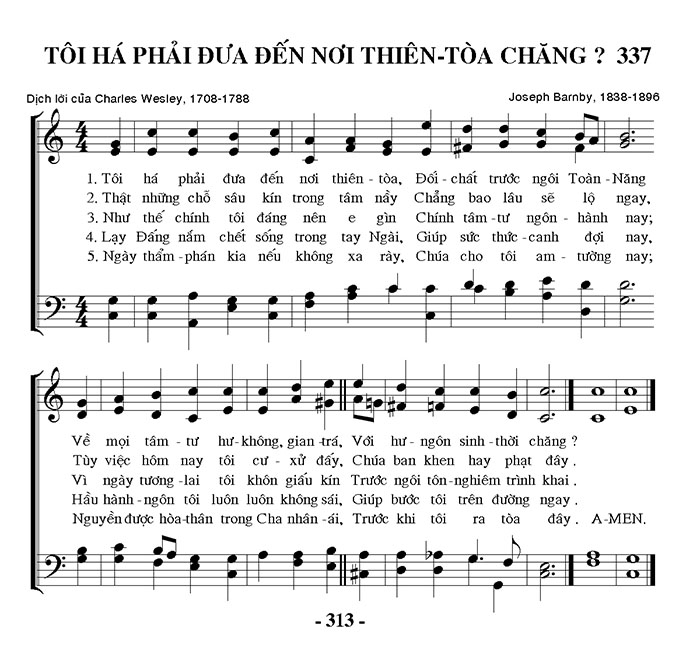1. Tôi há phải đưa đến nơi thiên tòa, Đối chất trước ngôi Toàn Năng Về mọi tâm tư hư không, gian trá, Với hư ngôn sinh thời chăng? 2. Thật những chỗ sâu kín trong tâm nầy Chẳng bao lâu sẽ lộ ngay, Tùy việc hôm nay tôi cư xử đấy, Chúa ban khen hay phạt đây. 3. Như thế chính tôi đáng nên e gìn Chính tâm tư ngôn hành nay; Vì ngày tương lai tôi khôn giấu kín Trước ngôi tôn nghiêm trình khai. 4. Lạy Đấng nắm chết sống trong tay Ngài, Giúp sức thức canh đợi nay, Hầu hành ngôn tôi luôn luôn không sái, Giúp bước tôi trên đường ngay. 5. Ngày thẩm phán kia nếu không xa rày, Chúa cho tôi am tường nay; Nguyện được hòa thân trong Cha nhân ái, Trước khi tôi ra tòa đấy. A-MEN.
