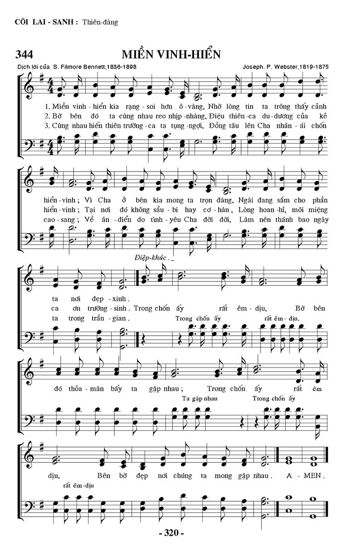 1. Miền vinh - hiển kia rạng - soi hơn ô-vàng, Nhờ lòng tin ta trông thấy cảnh hiển - vinh; Vì Cha ở bên kia mong ta trọn đàng, Ngài đang sắm cho phần ta nơi đẹp - xinh. 2. Bờ bên đó ta cùng nhau reo nhịp nhàng, Điệu thiên ca du dương của kẻ hiển - vinh; Tại nơi đó không sầu - bi hay cơ hàn, Lòng hoan hỉ, môi miệng ca ơn trường - sinh. Trong chốn ấy rất êm dịu, Bờ bên đó thỏa mãn bấy ta gặp nhau; 3. Cùng nhau hiến thiên trường - ca ta tụng ngợi, Đồng tâu lên Cha nhân ái chốn cao-sang; Về ân điển do tình yêu Cha đời đời, Làm nên thánh bao ngày ta trong trần - gian. Trong chốn ấy rất êm dịu, Trong chốn ấy rất êm dịu, Ta gặp nhau Trong chốn ấy rất êm dịu Điệp khúc: Bên bờ đẹp nơi chúng ta mong gặp nhau. A - MEN.