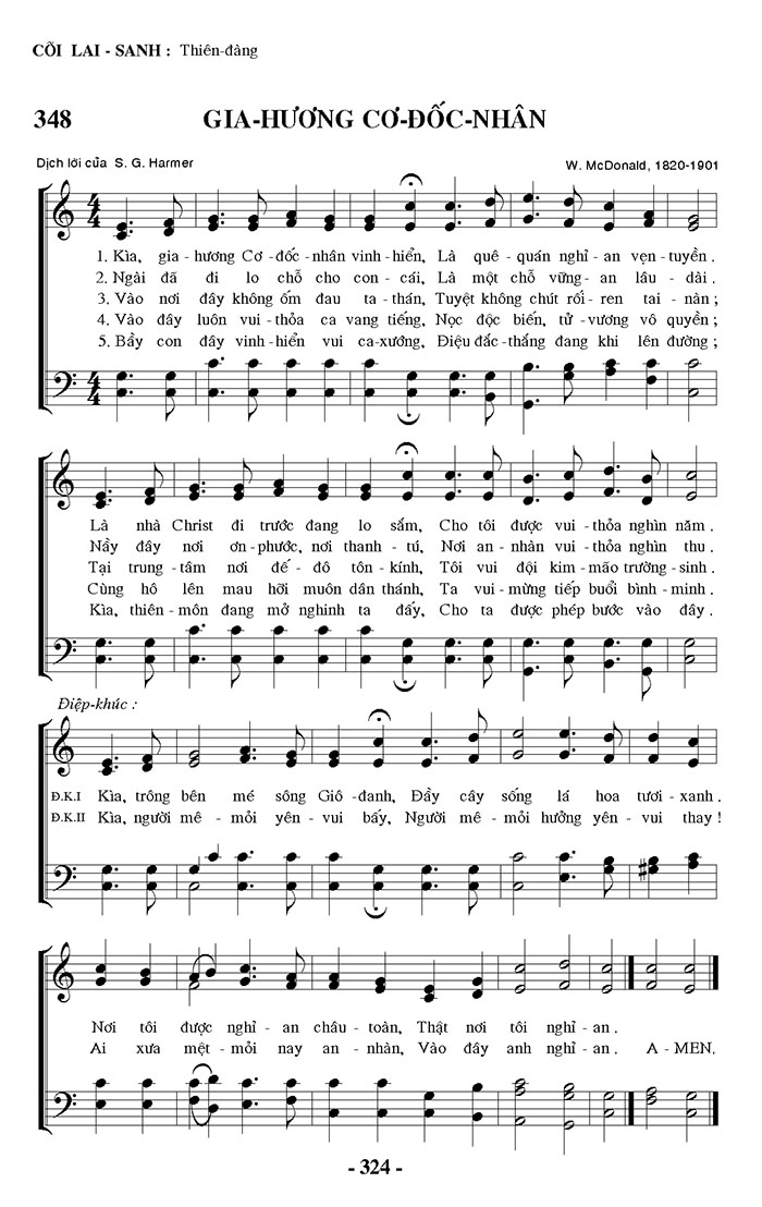 1. Kìa, gia - hương Cơ - đốc - nhân vinh hiển, Là quê - quán nghỉ - an vẹn - tuyển. Là nhà Christ đi trước đang lo sắm, Cho tôi được vui - thỏa nghìn năm. Nơi tôi được nghỉ - an châu toàn, Thật nơi tôi nghỉ - an. 2. Ngài đã di lo chỗ cho con cái, Là một chỗ vững - an lâu dài. Nầy đây nơi ơn - phước, nơi thanh tú, Nơi an - nhân vui - thỏa nghìn thu. Ai xưa mệt - mỏi nay an - nhàn, Vào đây anh nghỉ - an. 3. Vào nơi đây không ốm đau ta - thán, Tuyệt không chút rối - ren tai nàn; Tại trung tâm nơi đế - đô tôn kính, Tôi vui đội kim - mão trường - sinh. Nơi tôi được nghỉ - an châu toàn, Thật nơi tôi nghỉ - an. 4. Vào đây luôn vui - thỏa ca vang tiếng, Nọc độc biến, tử - vương vô quyền; Cùng hô lên mau hỡi muôn dân thánh, Ta vui - mừng tiếp buổi bình - minh. Ai xưa mệt - mỏi nay an - nhàn, Vào đây anh nghỉ - an. 5. Bầy con đây vinh hiển vui ca xướng, Điệu đắc - thắng đang khi lên đường; Kìa, thiên - môn đang mở nghinh ta đấy, Cho ta được phép bước vào đây. Nơi tôi được nghỉ - an châu toàn, Thật nơi tôi nghỉ - an. Điệp khúc: Đ.K.I Kìa, trông bên mé sông Giô-đanh, Đầy cây sống lá hoa tươi - xanh. Đ.K.II Kìa, người mê - mỏi yên - vui bấy, Người mê - mỏi hưởng yên - vui thay! Outro: A - MEN.