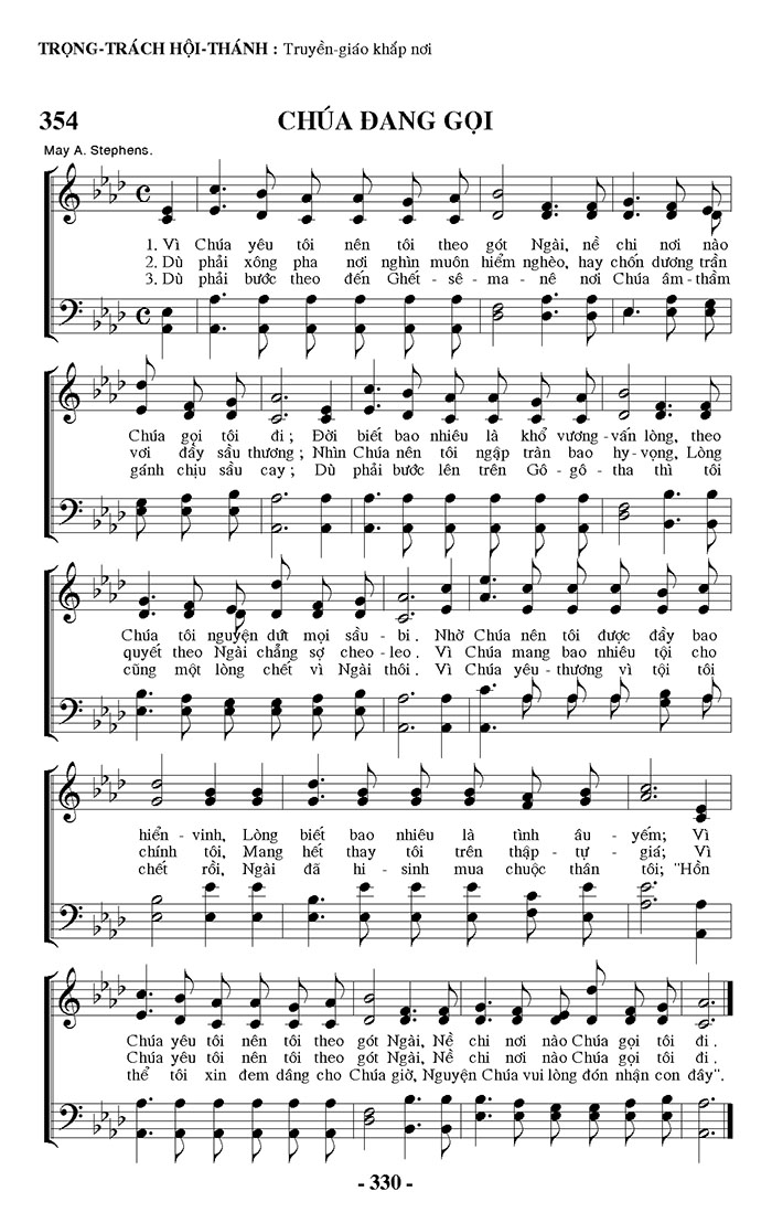 1. Vì Chúa yêu tôi nên tôi theo gót Ngài, nề chi nơi nào Chúa gọi tôi đi; Đời biết bao nhiêu là khổ vương - vấn lòng, theo Chúa tôi nguyện dứt mọi sầu bi. Nhờ Chúa nên tôi được đầy bao hiển - vinh, Lòng biết bao nhiêu là tình âu - yếm; Vì Chúa yêu tôi nên tôi theo gót Ngài, Nề chi nơi nào Chúa gọi tôi đi. 2. Dù phải xông pha nơi nghìn muôn hiểm nghèo, hay chốn dương trần với đầy sầu thương; Nhìn Chúa nên tôi ngập tràn bao hy vọng, Lòng quyết theo Ngài chẳng sợ cheo-leo. Vì Chúa mang bao nhiêu tội cho chính tôi, Mang hết thay tôi trên thập - tự giá; Vì Chúa yêu tôi nên tôi theo gót Ngài, Nề chi nơi nào Chúa gọi tôi đi. 3. Dù phải bước theo đến Ghết - sê - ma - nê nơi Chúa âm - thẩm gánh chịu sầu cay; Dù phải bước lên trên Gô - gô - tha thì tôi cũng một lòng chết vì Ngài thôi. Vì Chúa yêu - thương vì tội tôi chết rồi, Ngài đã hi - sinh mua chuộc thân tôi; "Hồn thể tôi xin đem dâng cho Chúa giờ, Nguyện Chúa vui lòng đón nhận con đây". chorus. Chúa gọi tôi đi; Đời biết bao nhiêu là khổ vương - vấn lòng, theo với đầy sầu thương; Nhìn Chúa nên tôi ngập tràn bao hy vọng, Lòng gánh chịu sầu cay; Dù phải bước lên trên Gô - gô - tha thì tôi Chúa tôi nguyện dứt mọi sầu bi. Nhờ Chúa nên tôi được đầy bao quyết theo Ngài chẳng sợ cheo-leo. Vì Chúa mang bao nhiêu tội cho cũng một lòng chết vì Ngài thôi. Vì Chúa yêu - thương vì tội tôi hiển - vinh, Lòng biết bao nhiêu là tình âu - yếm; Vì chính tôi, Mang hết thay tôi trên thập - tự giá; Vì chết rồi, Ngài đã hi - sinh mua chuộc thân tôi; "Hồn Chúa yêu tôi nên tôi theo gót Ngài, Nề chi nơi nào Chúa gọi tôi đi. Chúa yêu tôi nên tôi theo gót Ngài, Nề chi nơi nào Chúa gọi tôi đi. thể tôi xin đem dâng cho Chúa giờ, Nguyện Chúa vui lòng đón nhận con đây".